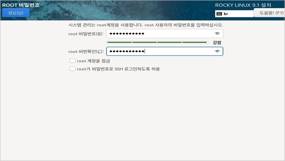 마지막으로 root 의 패스워드를 설정한 다음 좌측 상단의 '완료' 버튼을 클릭합니다.