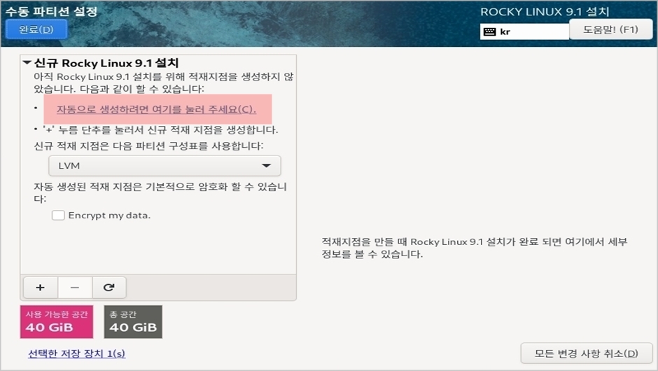 Disk 선택 화면에서 저장소 구성을 custom 으로 선택한 다음 좌측 상단의 '완료' 버튼을 클릭하면 파티션 메뉴로 넘어가게 되는데요, 여기서는 '자동으로 생성'을 클릭해서 마무리 하면 됩니다.