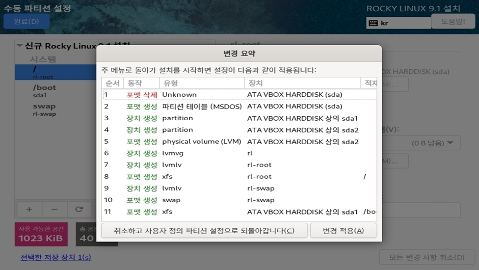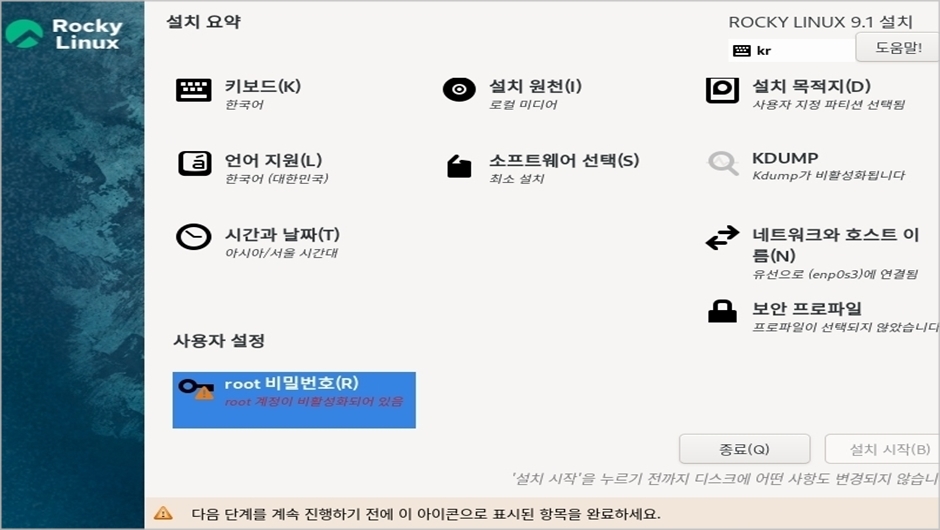 kdump는 커널에 문제가 생겼을 때 dump를 생성하는 옵션입니다. 테스트 용도라면 해당 체크 박스를 해제한 다음 좌측 상단의 '완료' 버튼을 클릭합니다.