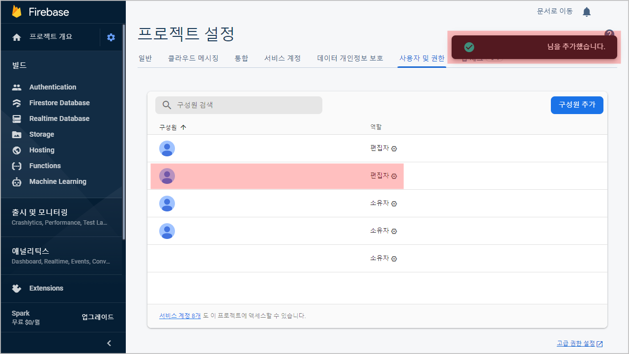 구성원을 추가한 다음 바로 역할에서 편집자 등의 권한을 부여하면 됩니다.