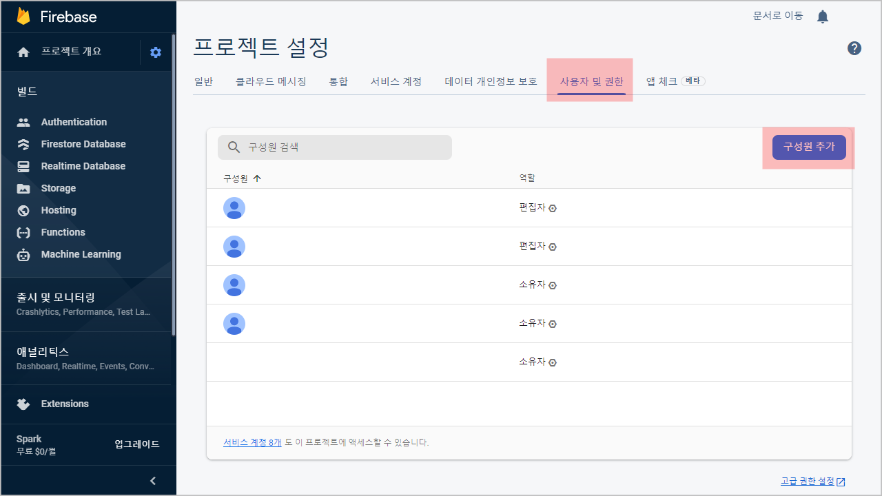 해당 메뉴에서 상단의 '사용자 및 권한' 탭으로 이동한 다음 파란색 '구성원 추가' 버튼을 선택합니다.