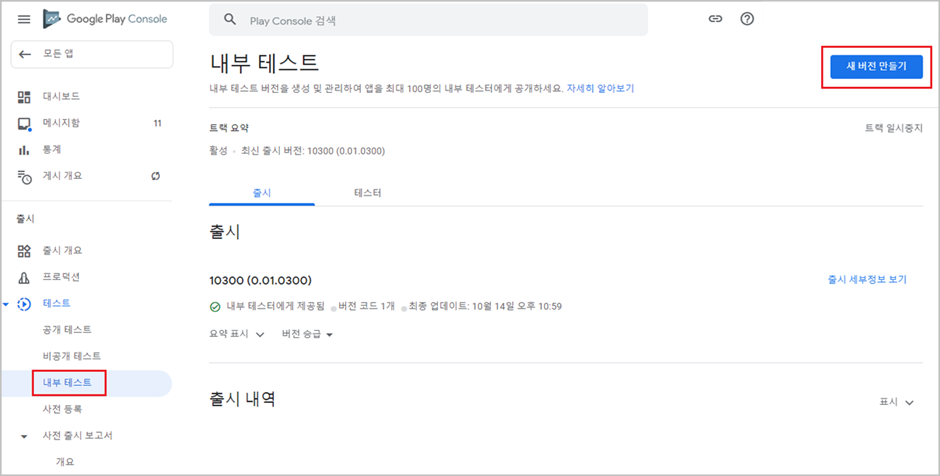 내부 테스트 → 새 버전 만들기를 선택합니다.
