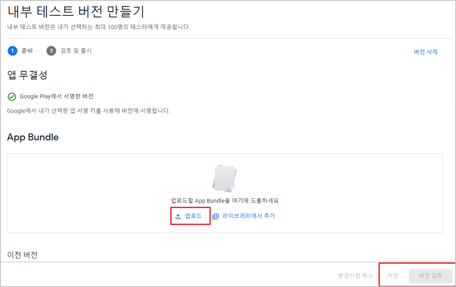 aab가 업로드 되면 저장 버튼이 활성화되는데, 저장을 선택하고, 버전 검토까지 클릭합니다.