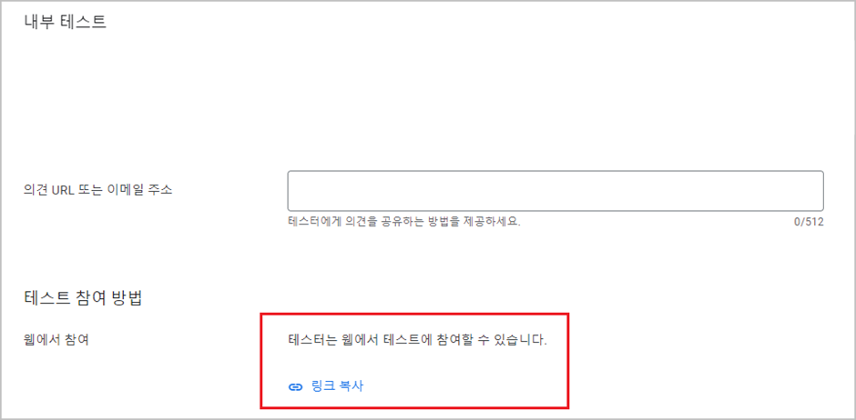 내부 테스트로 제출된 앱 → 내부테스트 → 테스터 탭 클릭 → 웹에서 참여 링크 복사
