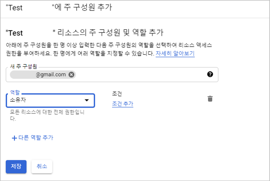 이관할 프로젝트 선택후 권한에서 이전할 계정에 소유자로 추가합니다.