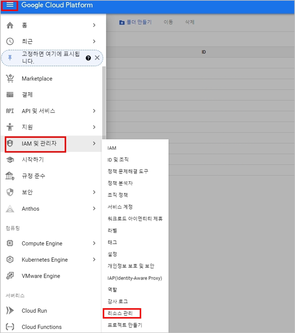 'Google Cloud Platform → IAM 및 관리자 → 리소스 관리' 로 이동합니다.