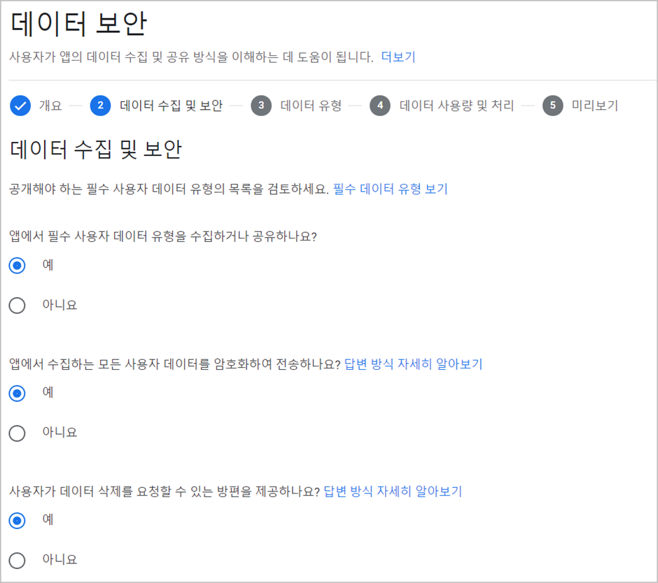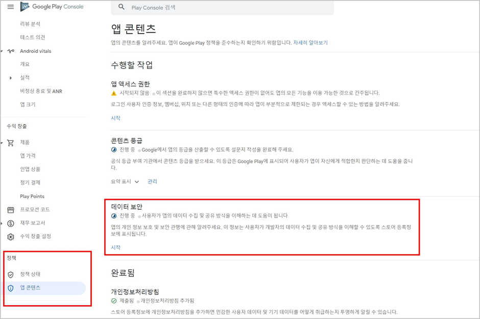 Google App Console 앱 콘텐츠 데이터 보안 항목