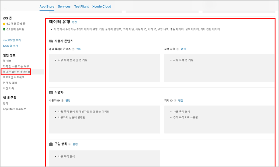 참고로 애플 앱 스토어 커넥트 정보와 비교하여 없는 항목을 추가해 주면 됩니다.
