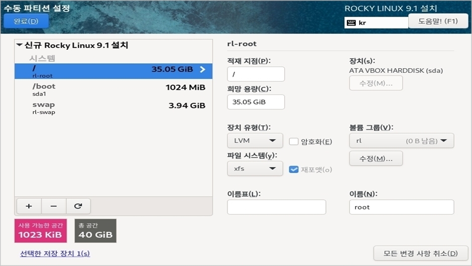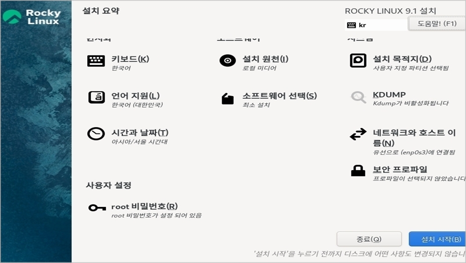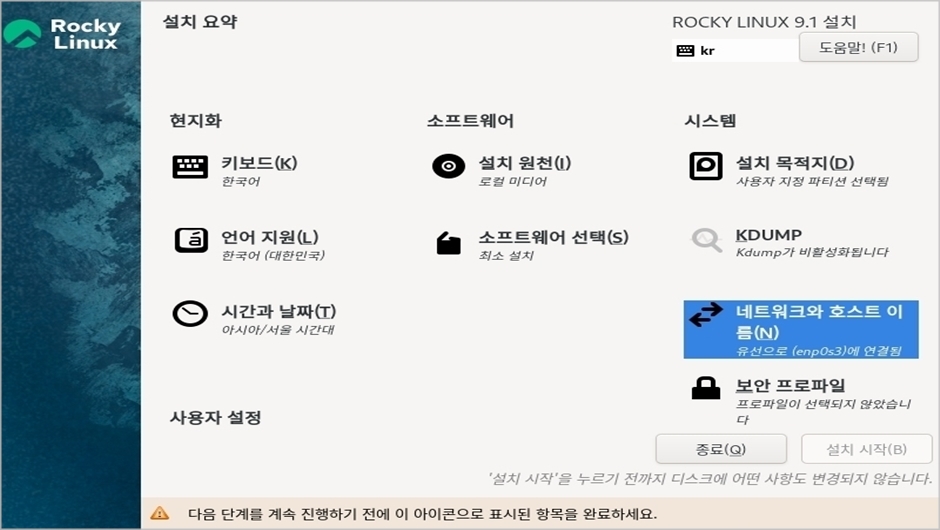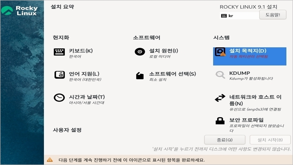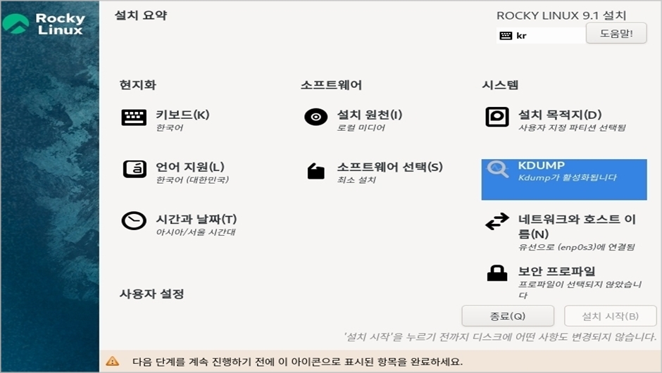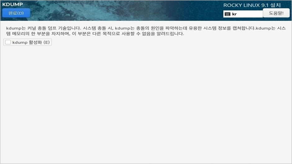 kdump는 커널에 문제가 생겼을 때 dump를 생성하는 옵션입니다. 테스트 용도라면 해당 체크 박스를 해제한 다음 좌측 상단의 '완료' 버튼을 클릭합니다.