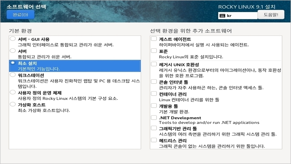 목적에 맞게 GUI (서버 - GUI 사용) 모드 혹은 CLI 모드 (최소 설치) 를 선택한 다음 좌측 상단의 '완료' 버튼을 클릭합니다.