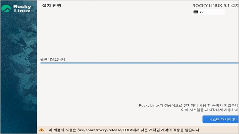 설치가 완료되면 우측 하단에 '시스템 재시작' 버튼이 활성화 되는데요, 해당 버튼을 클릭하면 재부팅이 됩니다.