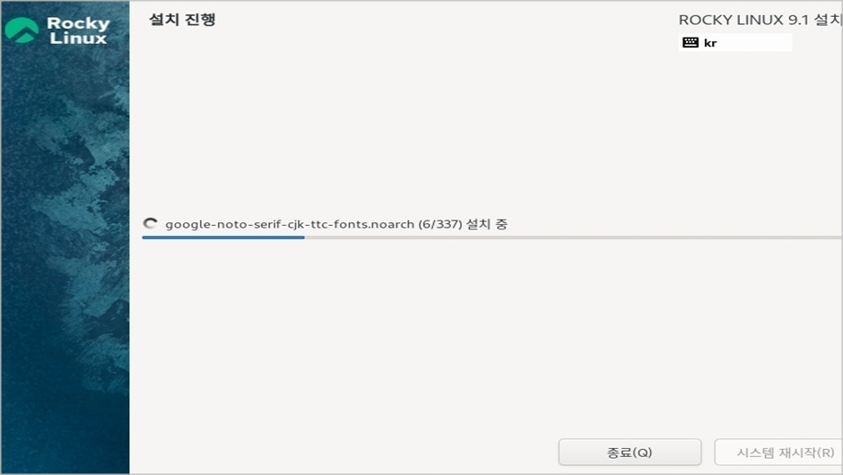제일 상단의 'install rocky linux 9.1'에 커서를 놓고 엔터를 입력하여 설치를 시작합니다.