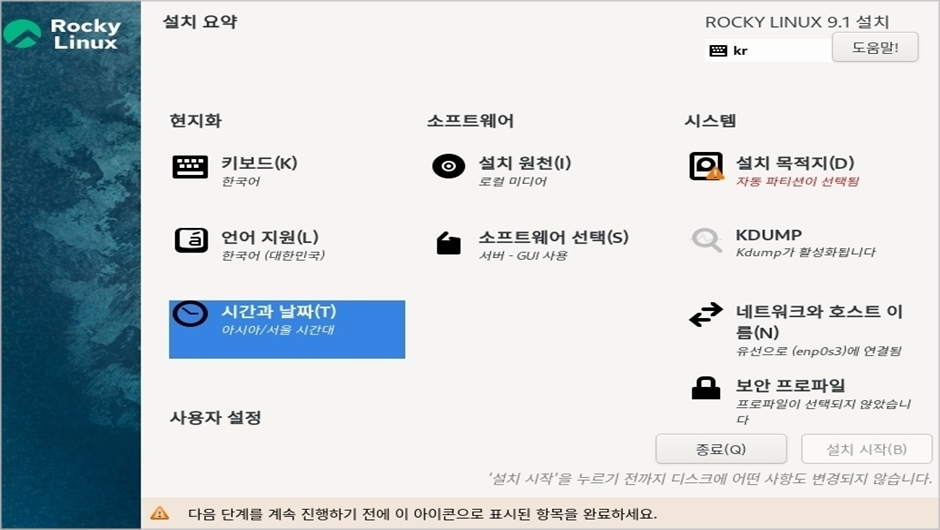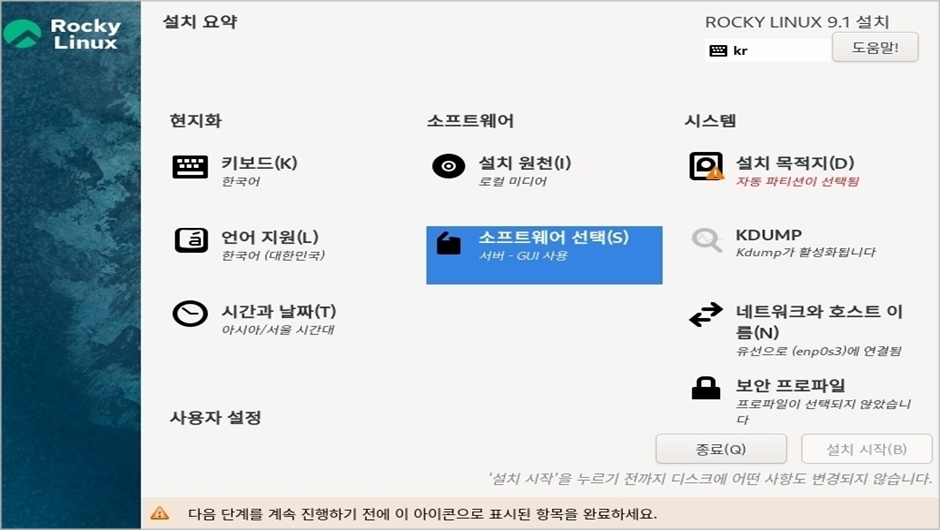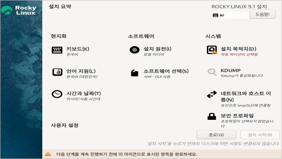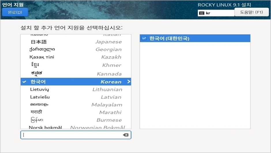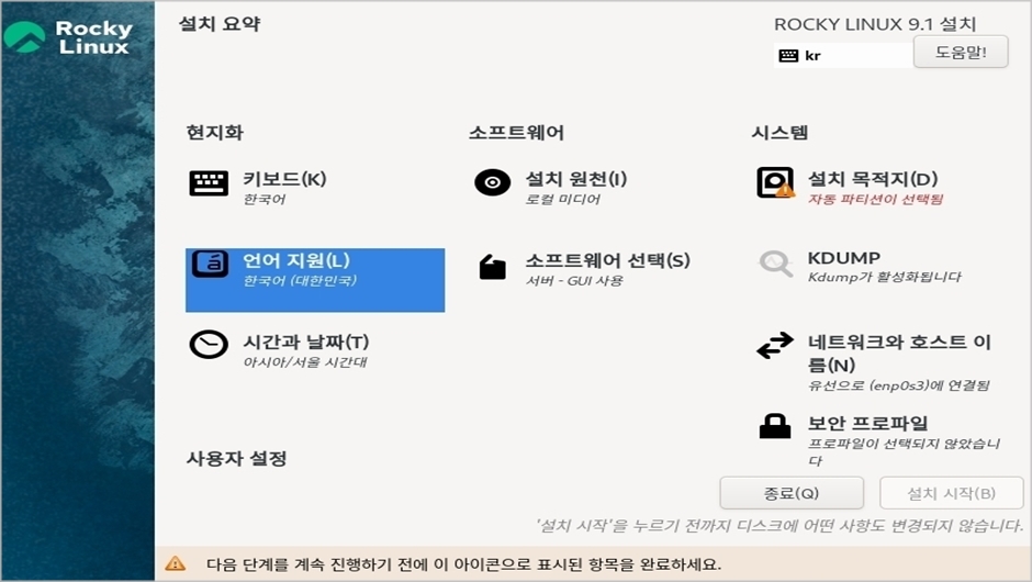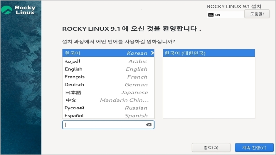가장 먼서 설치 언어를 선택하는 화면이 나오는데, rocky linux 9.1 은 자동으로 한국어가 선택되어 나오고 있어서 그냥 한국어로 설치를 진행하겠습니다!! (다른 버전은 English로 설치했었습니다.)