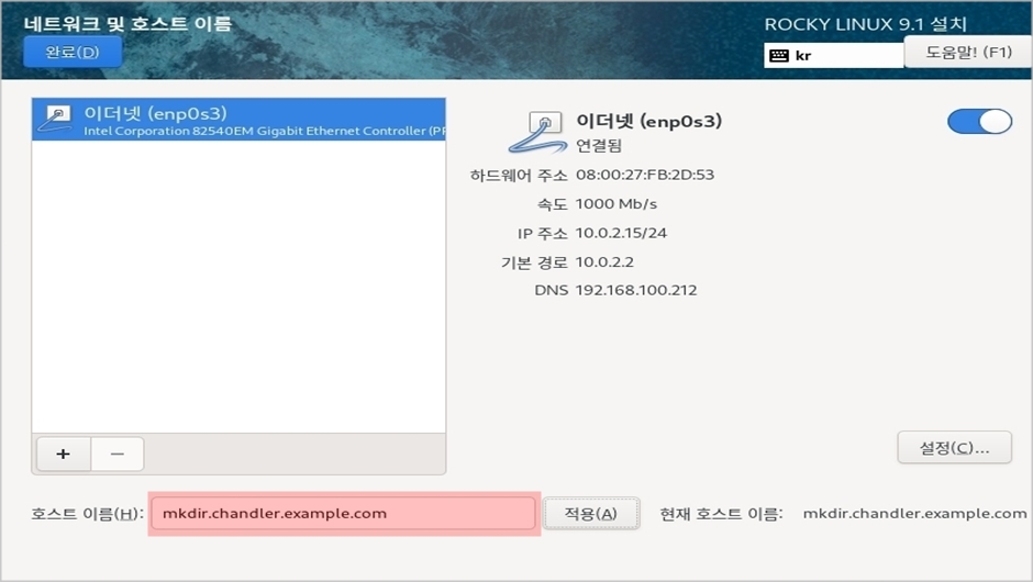 네트워크 인터페이스와 호스트네임을 설정하는 메뉴입니다. 네트워크 인터페이스는 사용할 수 있는 인터페이스가 자동으로 ON 설정이 되어 있습니다. 호스트네임만 하단에 입력하여 적용을 누르면 우측에 현재 호스트 이름에 입력한 호스트네임이 등록이 됩니다. 설정을 마무리한 다음 좌측 상단의 '완료' 버튼을 클릭합니다.