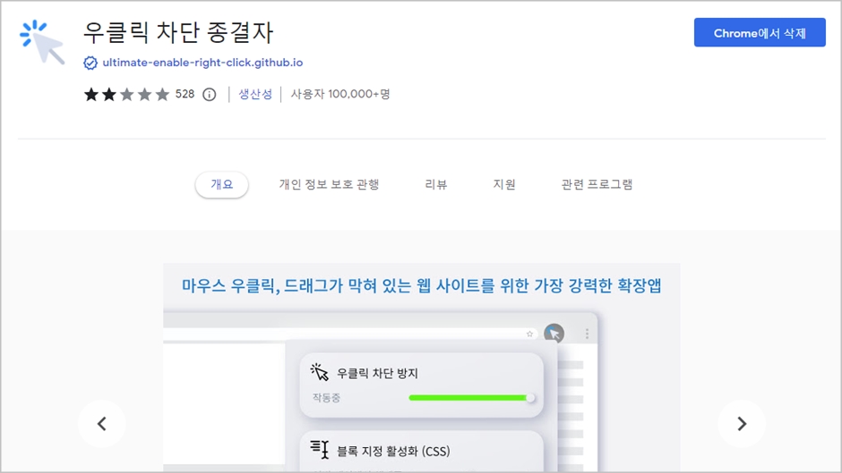 마우스를 사용하면서 오른쪽 버튼 클릭 및 텍스트를 블록 지정하여 복사하는 등의 기능을 막아 놓는 사이트가 많아지고 있습니다. 물론 불법적인 복제를 막기 위한 조치이지만, 개인적인 용도라면 아쉬운 경우가 많이 있는데요, 그럴 때 활용할 수 있는 크롬 확장 프로그랩입니다.