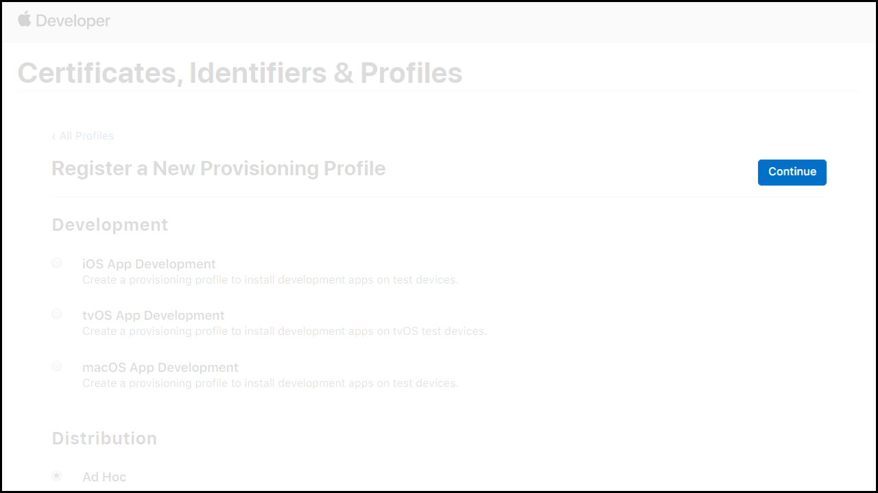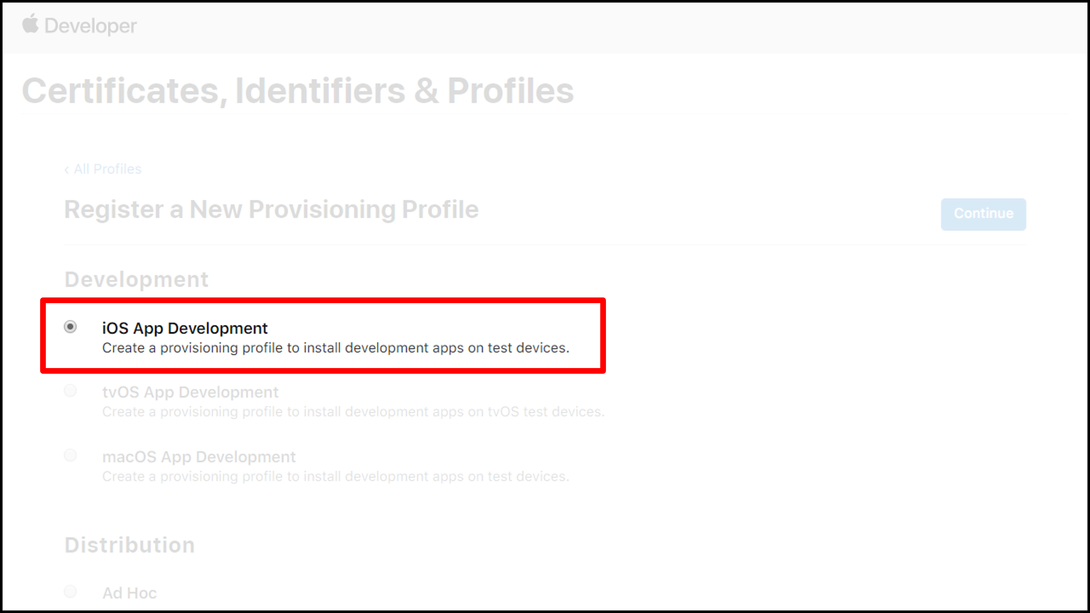 Development와 Distribution 선택이 완료되면 우측 상단의 ‘Continue’를 클릭합니다.