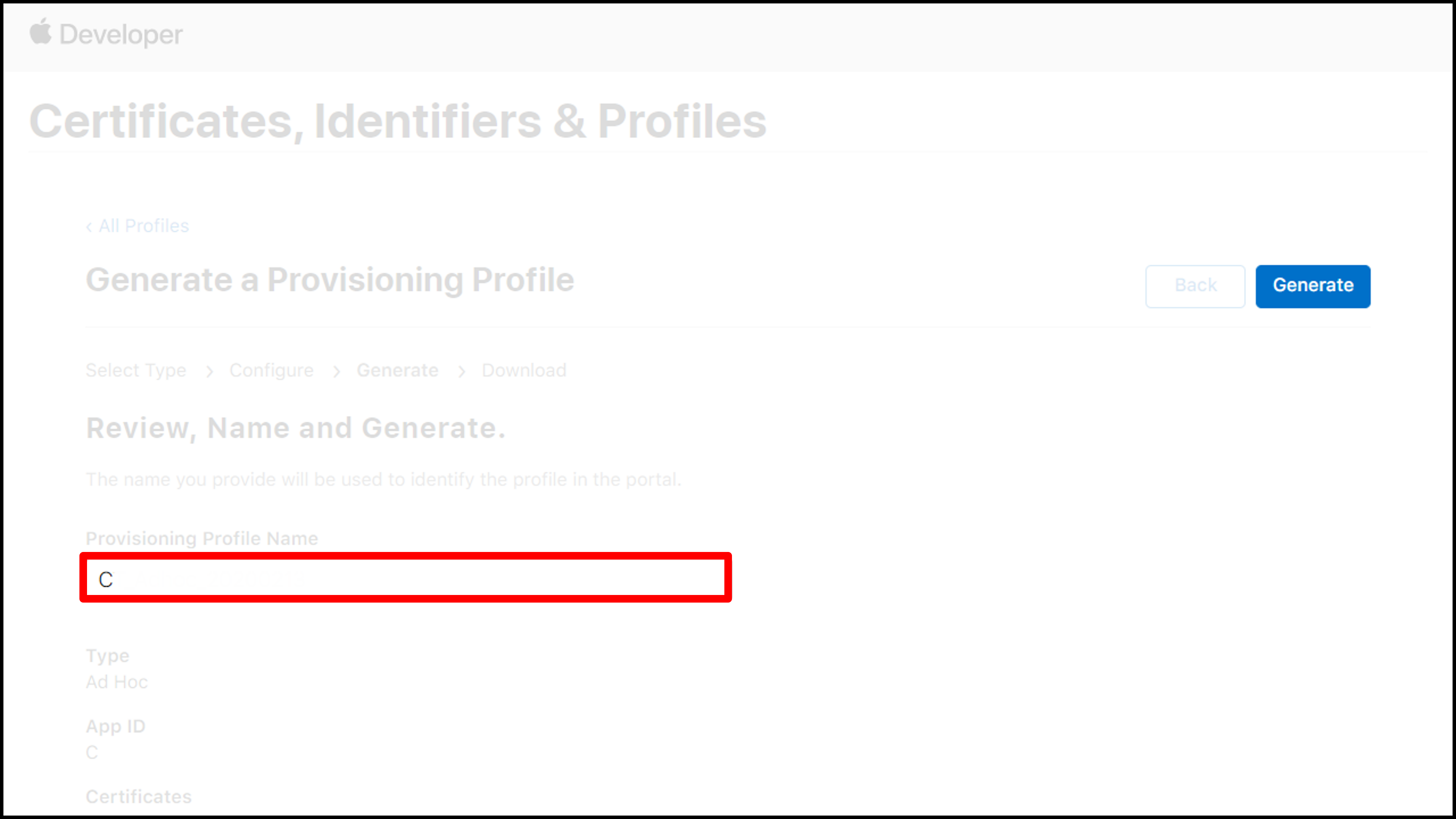 마지막으로 Provisioning Profile Name을 입력하고 우측의 ‘Generate’를 클릭합니다.