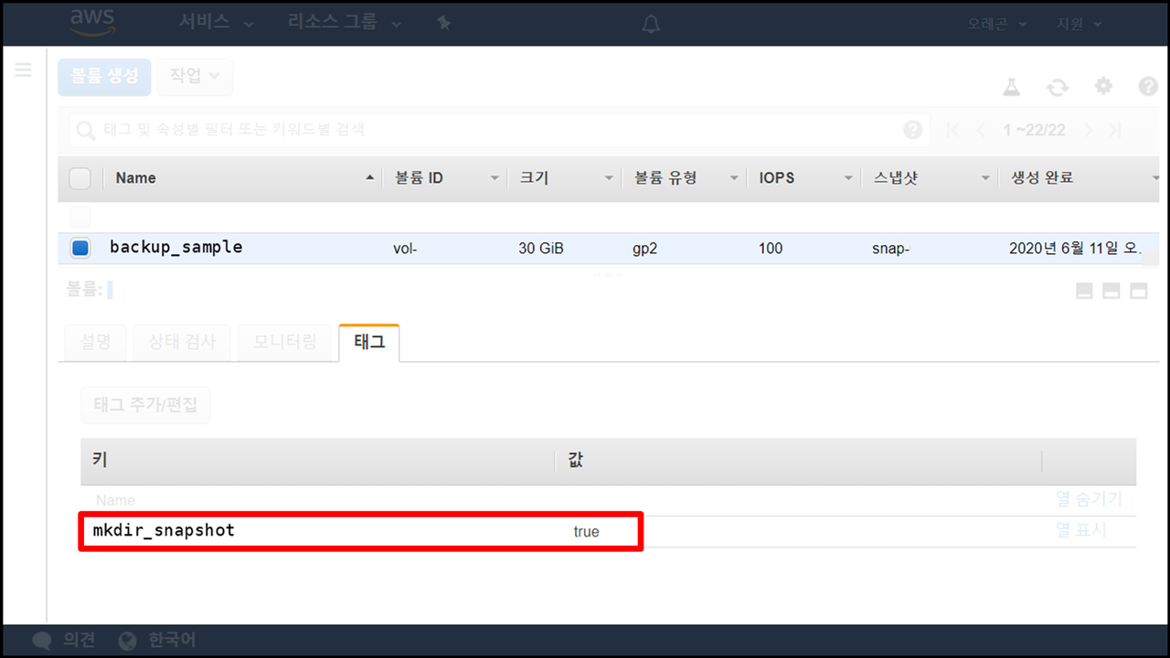 설정하면서 입력한대로 EBS 볼륨에 태그를 넣어주면 자동으로 백업을 진행하게 됩니다. (스냅샷 생성)