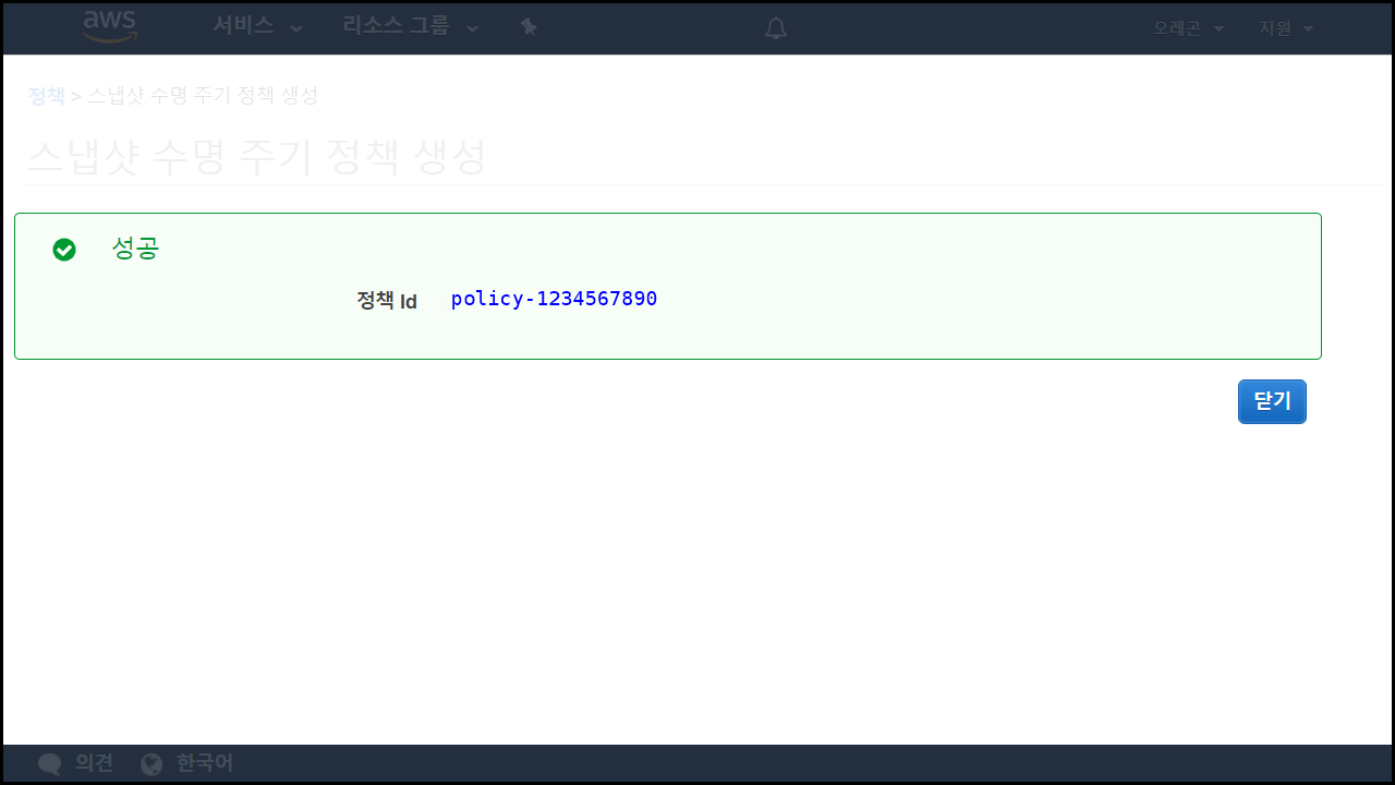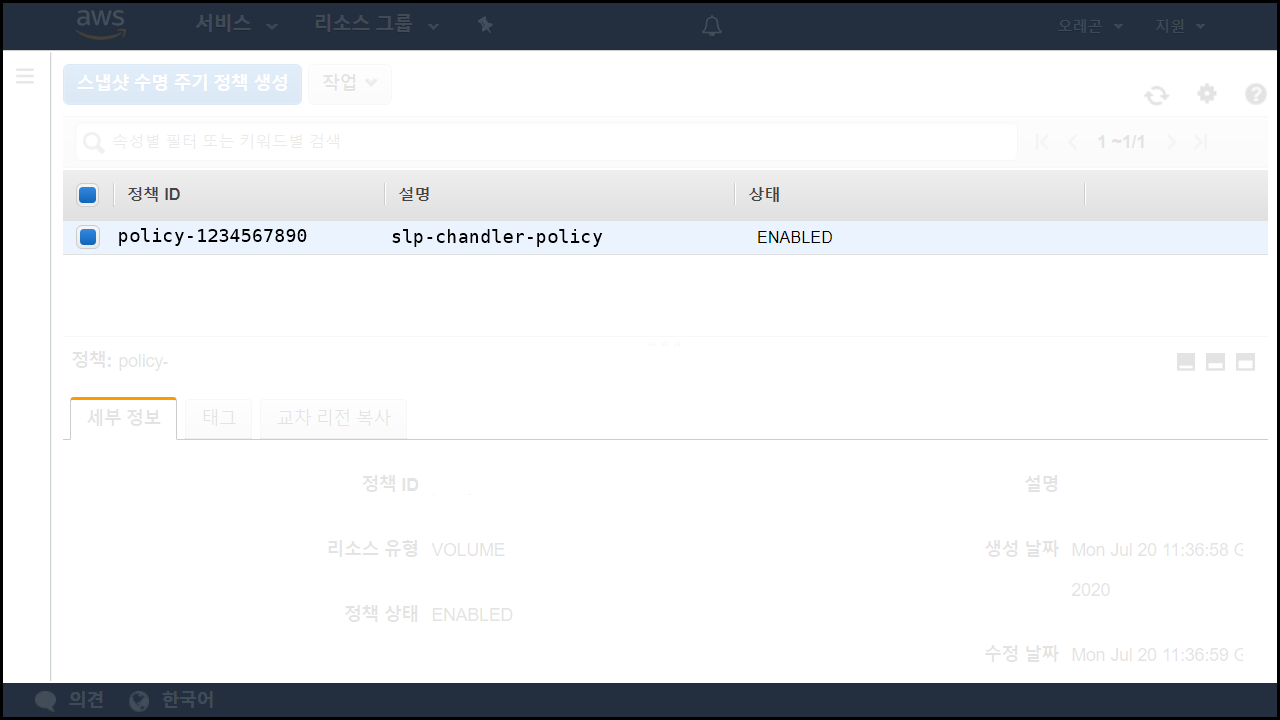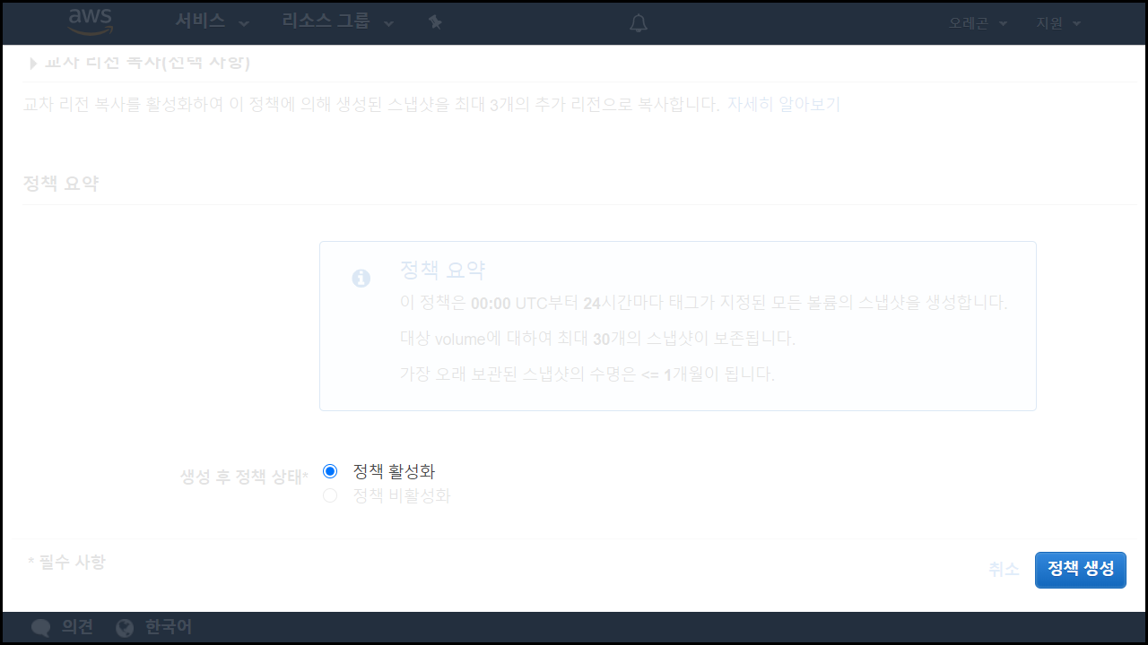 해당 메뉴로 이동하여 '스냅샷 수명 주기 정책 생성'을 선택합니다.