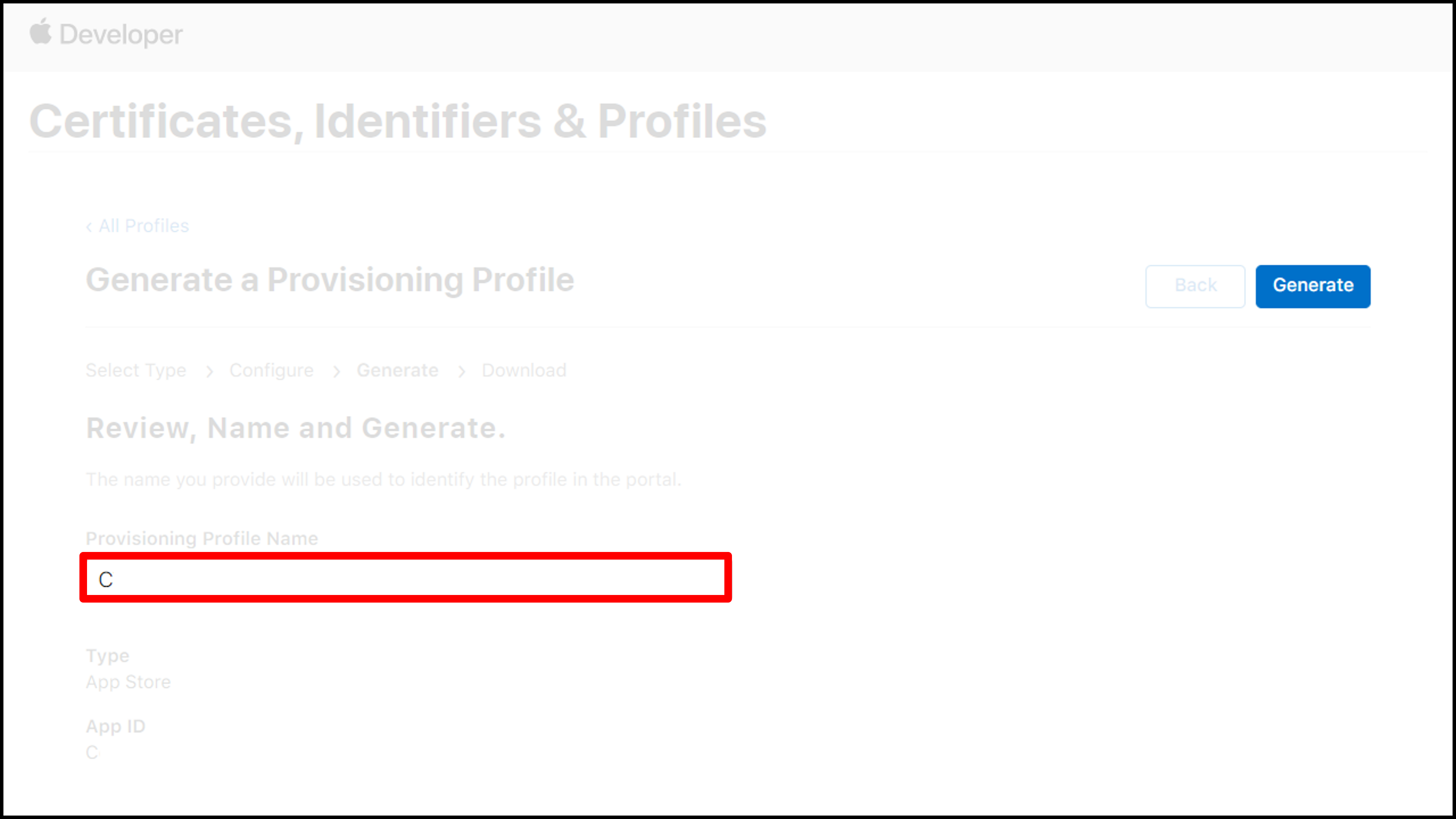 마지막으로 프로비저닝 이름을 입력하고 우측 상단의 ‘Generate’를 클릭하여 마무리 합니다. 프로비저닝 이름은 형상 관리를 위해 날짜 등을 붙여서 생성하는 것이 좋습니다. (예, chandler_appstore_provisioning_20990101)