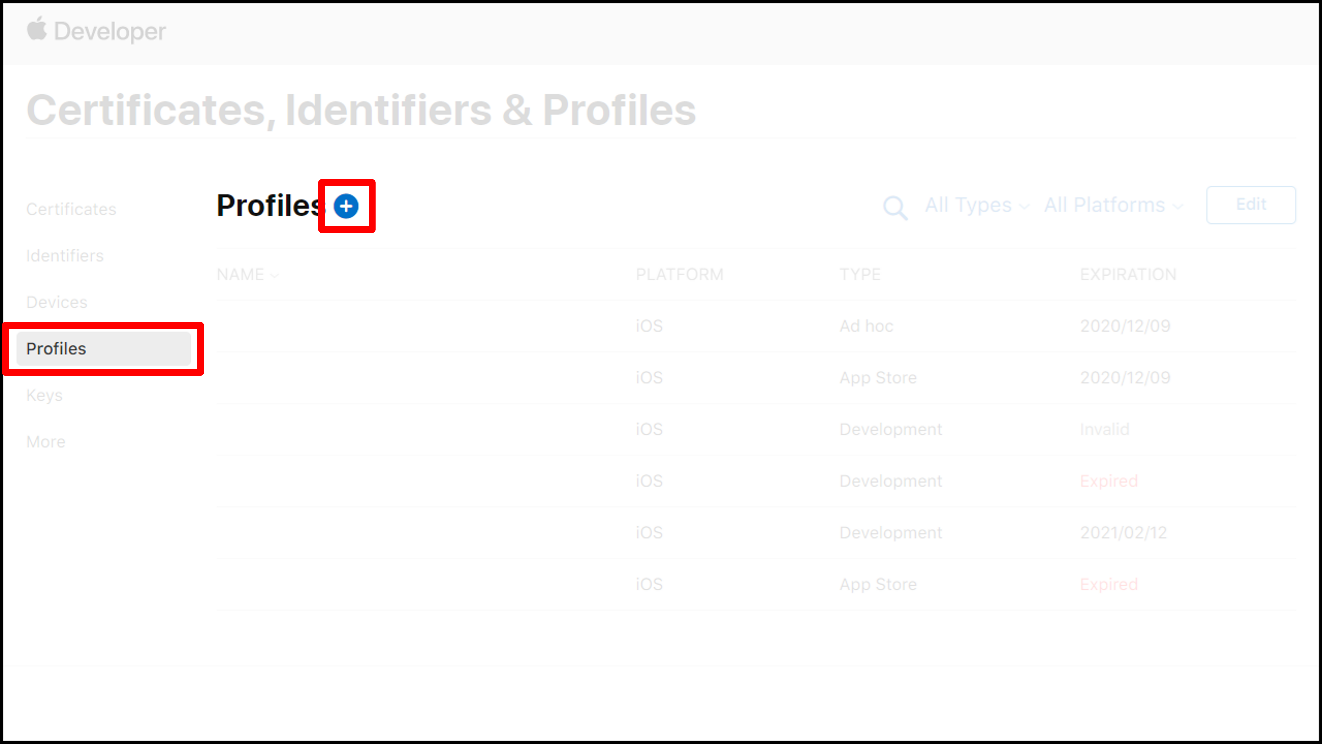 좌측 메뉴에서 ‘Profiles’를 선택하고 '+' 버튼을 클릭하여 신규 생성을 진행합니다.