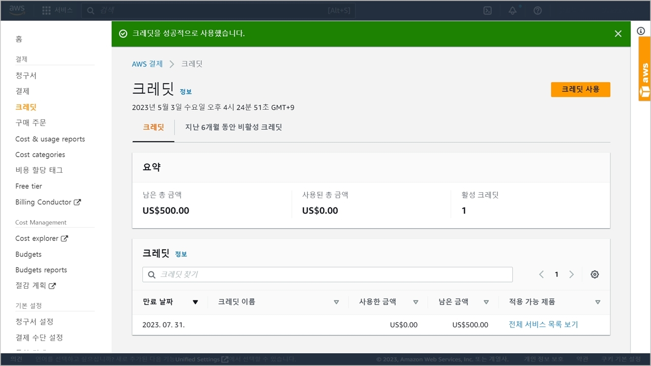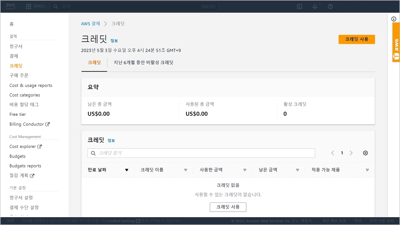 그런 다음 좌측 메뉴를 보면 '크레딧' 이 있는데요, 해당 메뉴를 선택한 다음 우측의 '크레딧 사용' 버튼을 선택합니다.