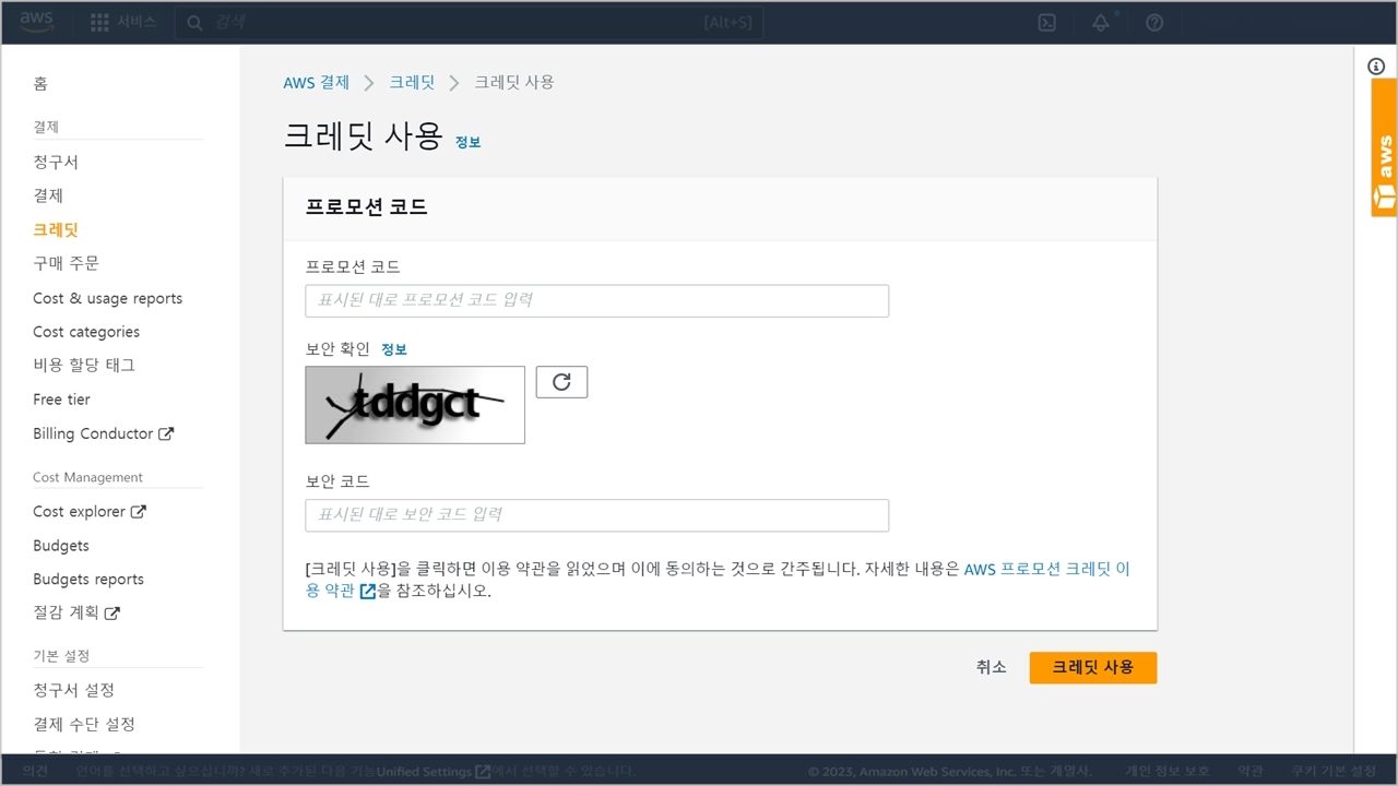 프로모션 코드 및 보안 확인(보안 코드)을 입력하고 우측 하단의 '크레딧 사용' 버튼을 클릭하면,