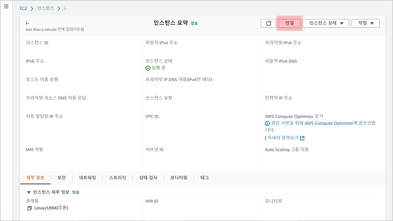 EC2 인스턴스 세부 정보 화면의 오른쪽 상단을 보면 '연결' 버튼이 있습니다. 해당 버튼을 선택하면,