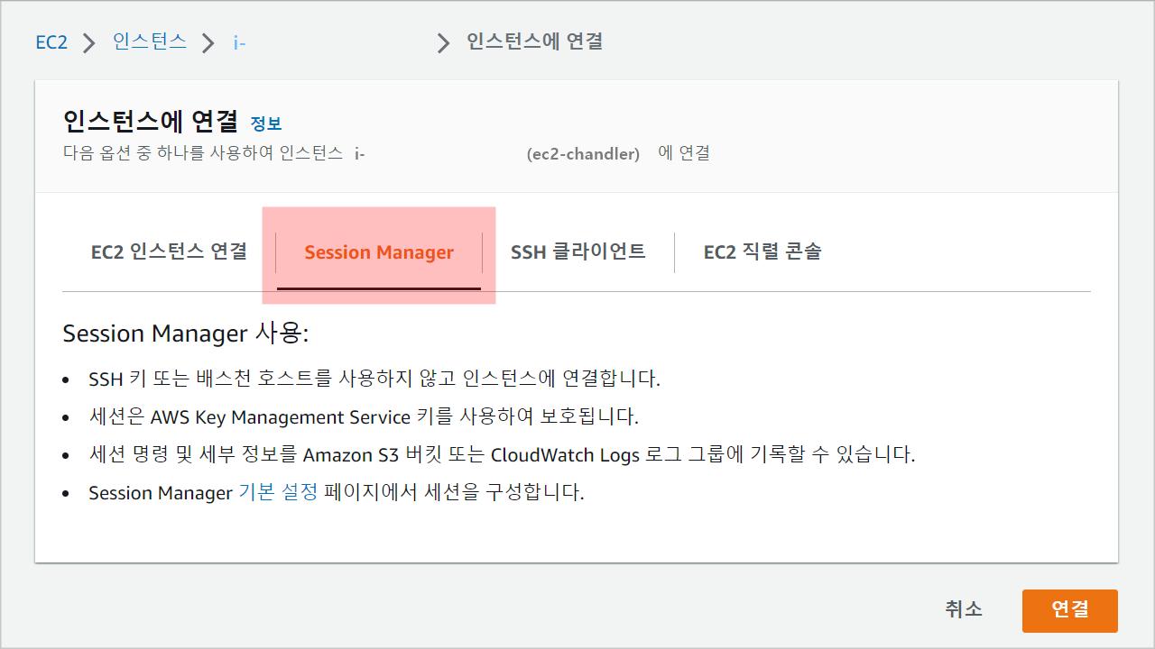 인스턴스에 연결하기 위한 4가지 방법이 나오는데요, 이 중에서 Session manager 탭을 선택하고 우측 하단의 '연결' 버튼을 선택합니다.