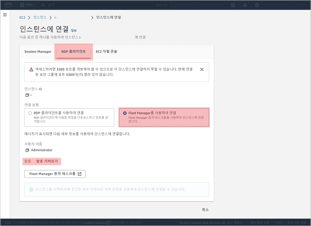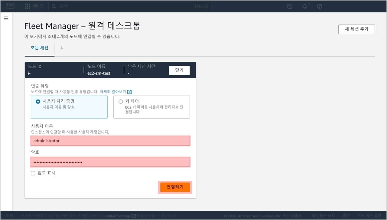 이후 Windows 내부에서 계정 생성 및 암호를 변경하고, 바로 Fleet manager 화면에서 사용자 이름 및 암호를 입력하여 접속하시면 됩니다. (사용자 생성 및 adminitrator 암호를 변경하지 않을 경우 암호 키 인증을 통해 암호를 계속 해독하여 접속해야 하는 불편함이 있으니 꼭 진행하세요)