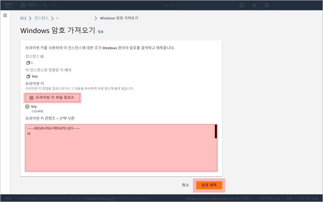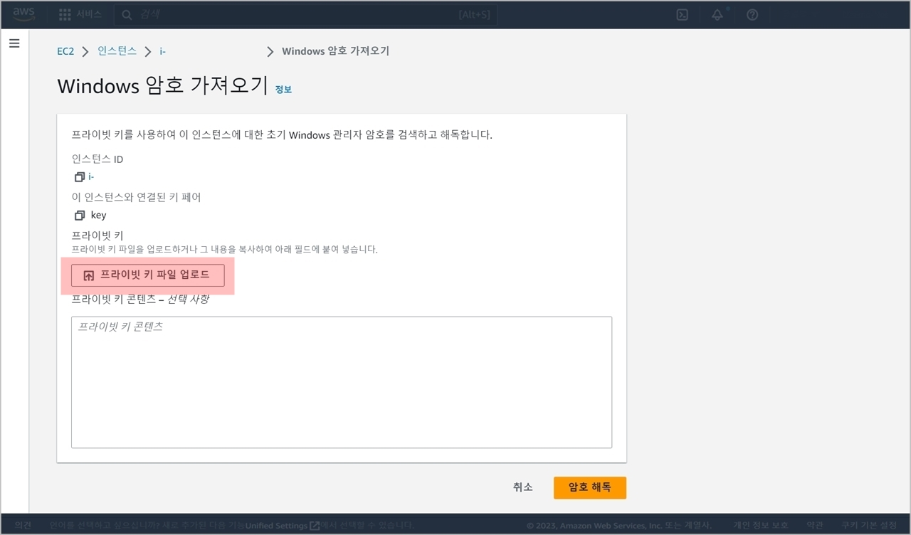 암호 가져오기 화면으로 전환되면, ‘프라이빗 키 파일 업로드’를 선택하고 EC2 인스턴스에 할당된 Key를 업로드합니다.