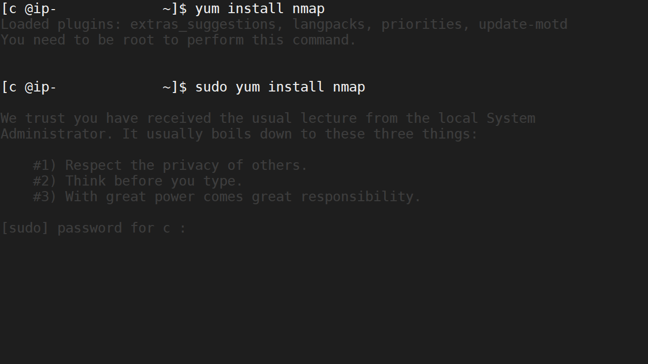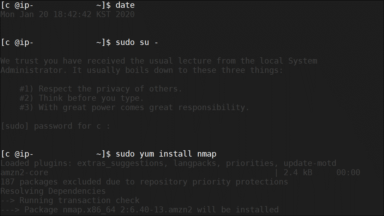 sudo 명령어를 사용해 보면 방금 생성한 계정은 yum에 대한 권한이 없는 것을 확인할 수 있습니다.