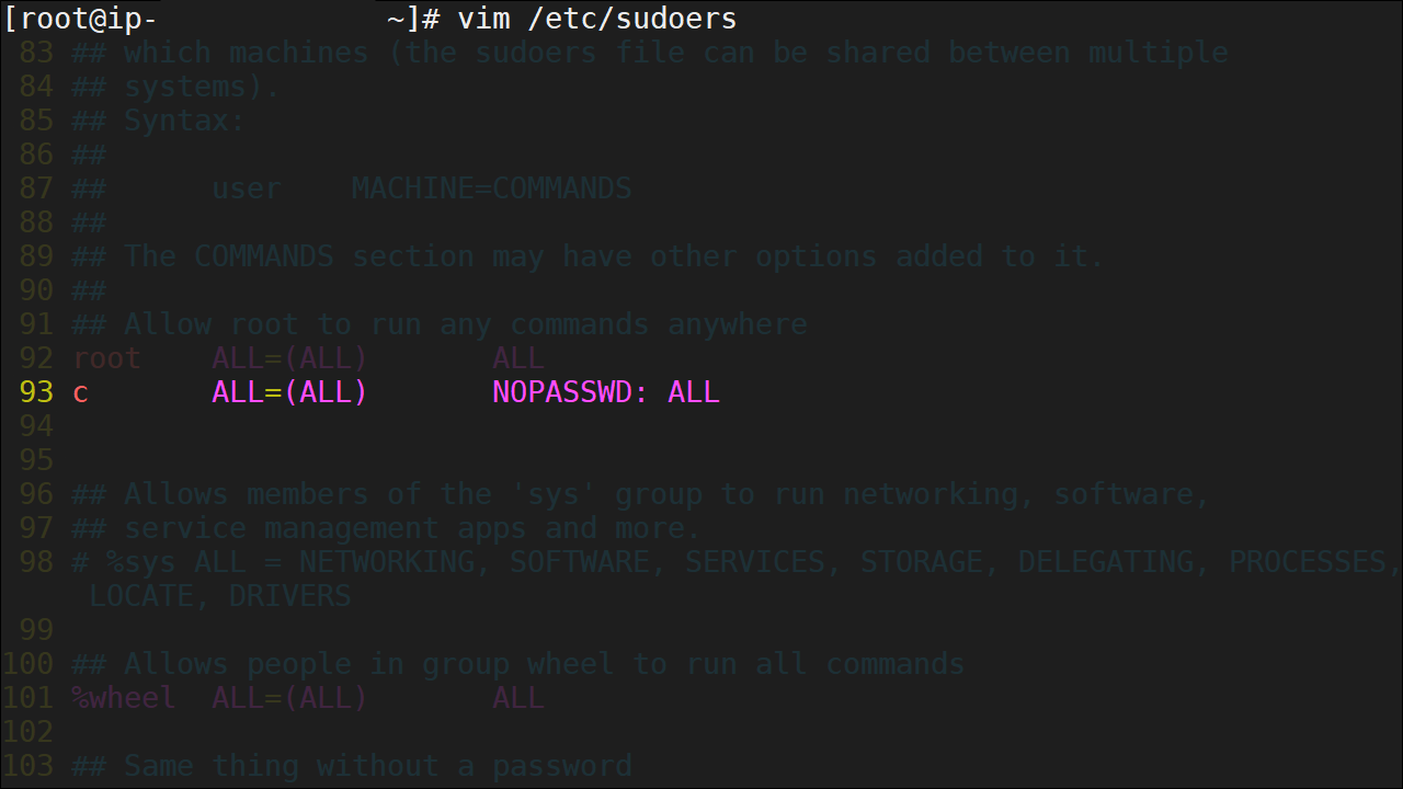 해당 내용은 /usr/bin/yum 명령어를 sudo 권한으로 사용할 수 있는 옵션입니다. sudo 권한으로 사용하고 싶은 명령어가 더 있을 경우 컴마(,) 로 구분하여 계속 추가하면 됩니다.