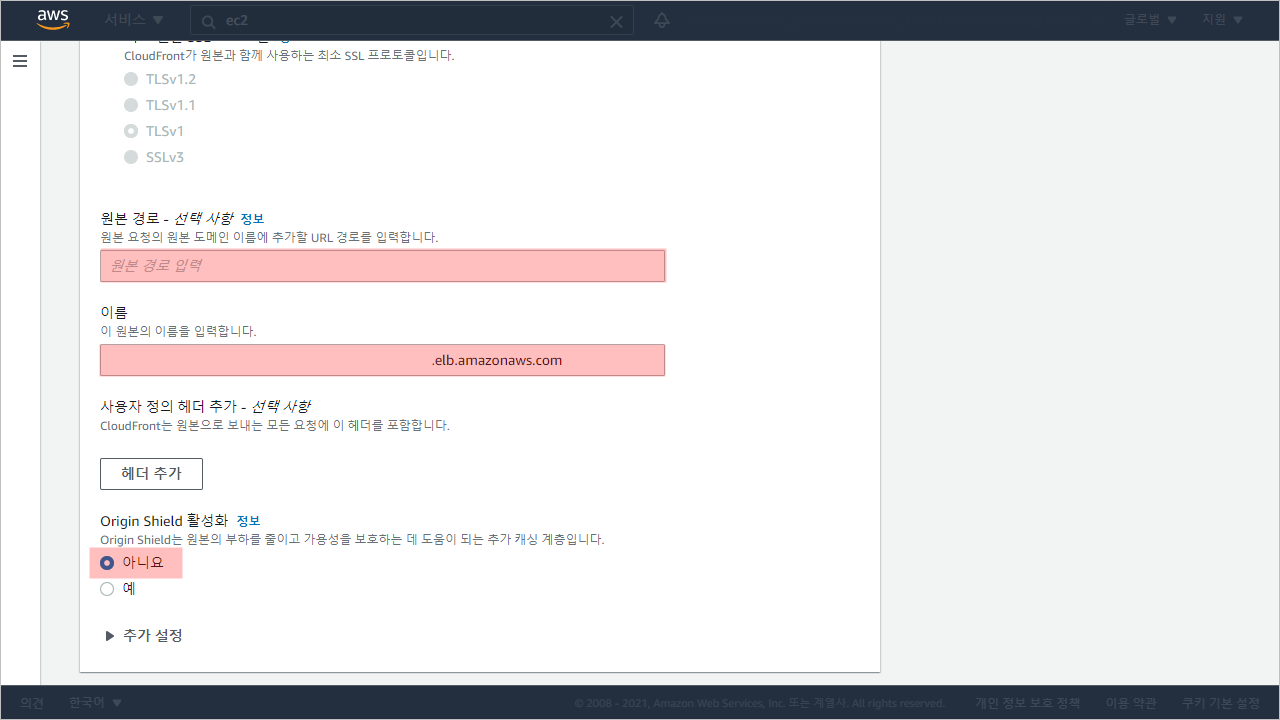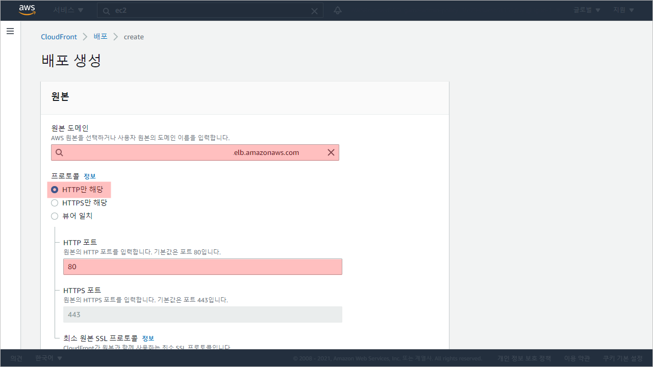 원본 도메인으로 ALB를 선택합니다. (ALB를 사용하지 않는다면 EC2를 바로 선택해도 되고, S3로 바로 연결한다면 S3 버킷을 선택하면 됩니다.)
