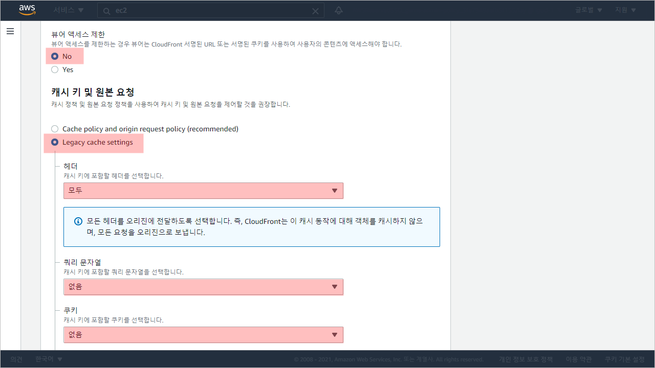 캐시는 Legacy로 선택하여 default 설정으로 진행해도 됩니다.