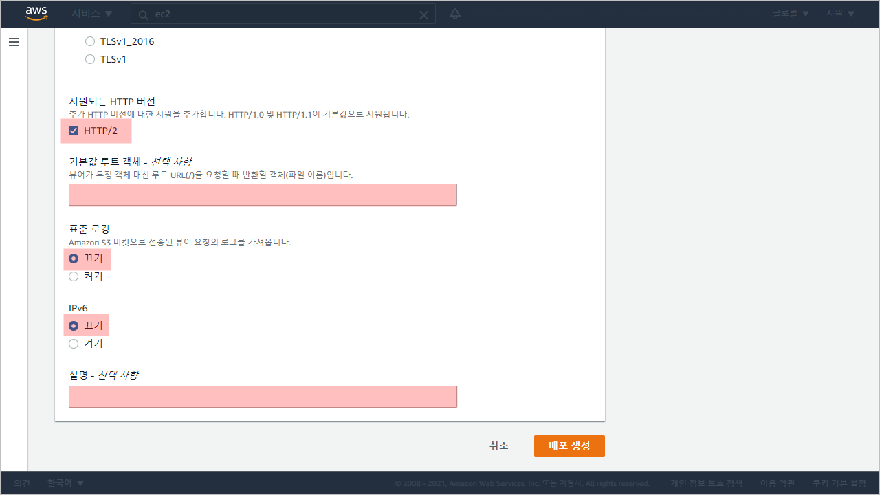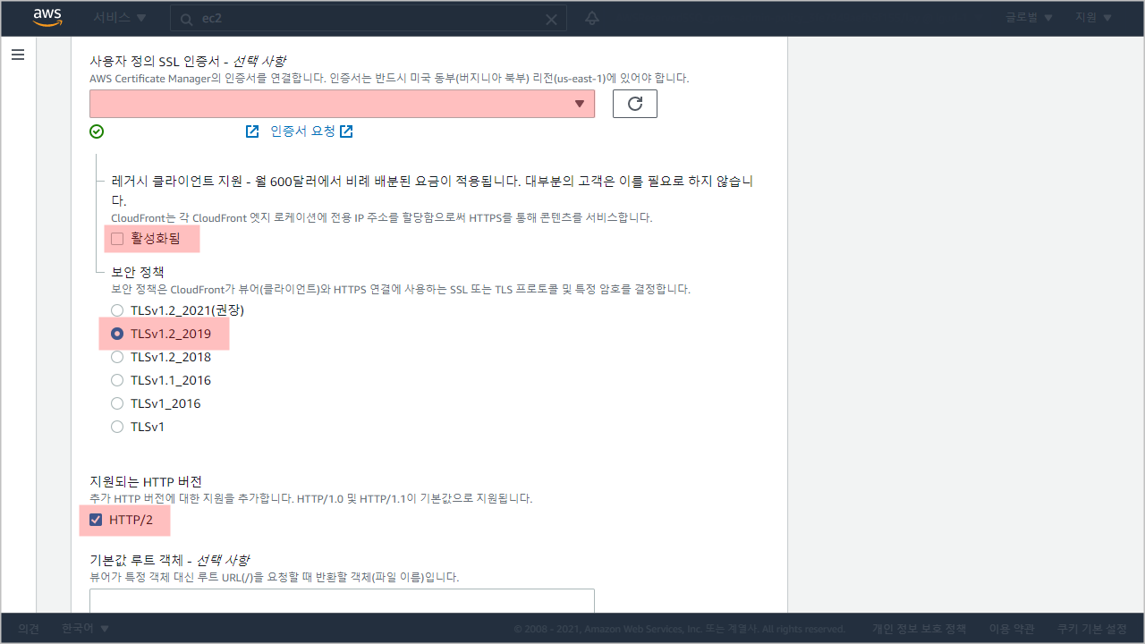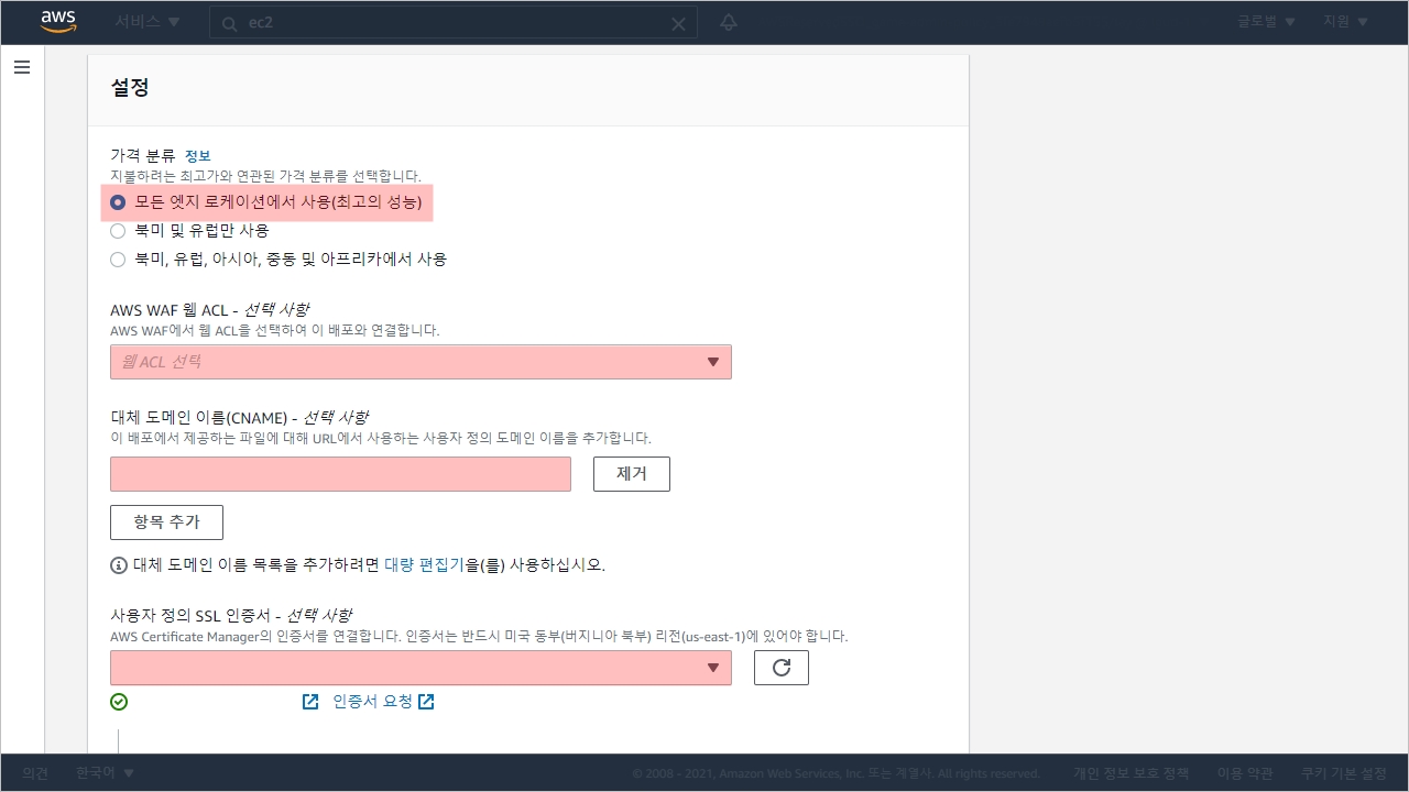 대체 도메인 이름은 입력해야 Route53에서 별칭으로 연동이 가능합니다. 추가로 ACM에 등록한 인증서를 SSL에 등록해 주세요.