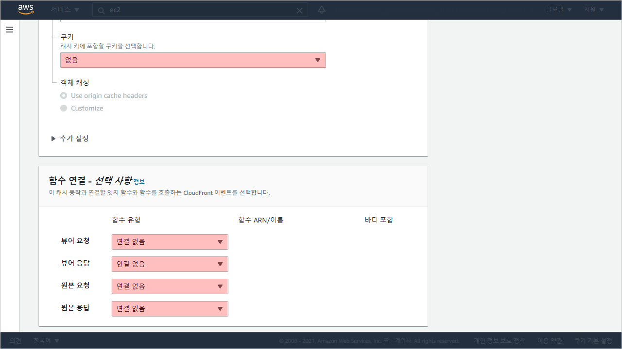함수는 특별한 기능을 넣어야 하는 경우 Lambda@Edge를 이용하여 활용하면 됩니다. 별 특이사항이 없다면 아무것도 설정하지 않고 넘어가세요!