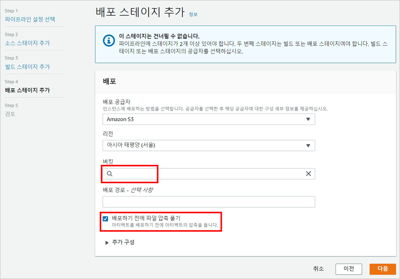 소스를 배포할 버킷을 선택합니다. 기본적으로 아티팩트 형태로 배포되기 때문에 배포하기 전에 파일 압축 풀기를 체크해 줍니다.