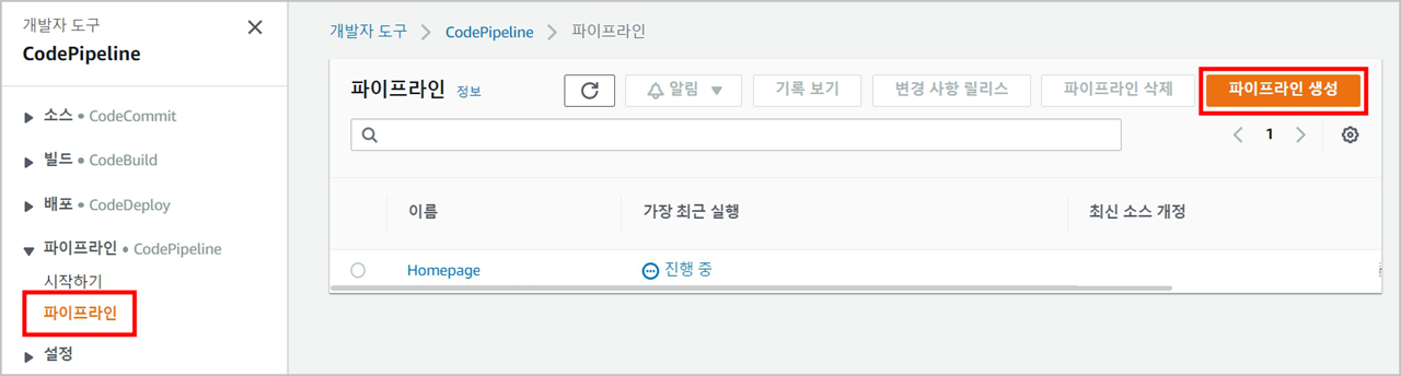 codepipeline 서비스에서 파이프라인 메뉴를 선택하고 오른쪽 상단의 '파이프라인 생성'을 선택합니다.