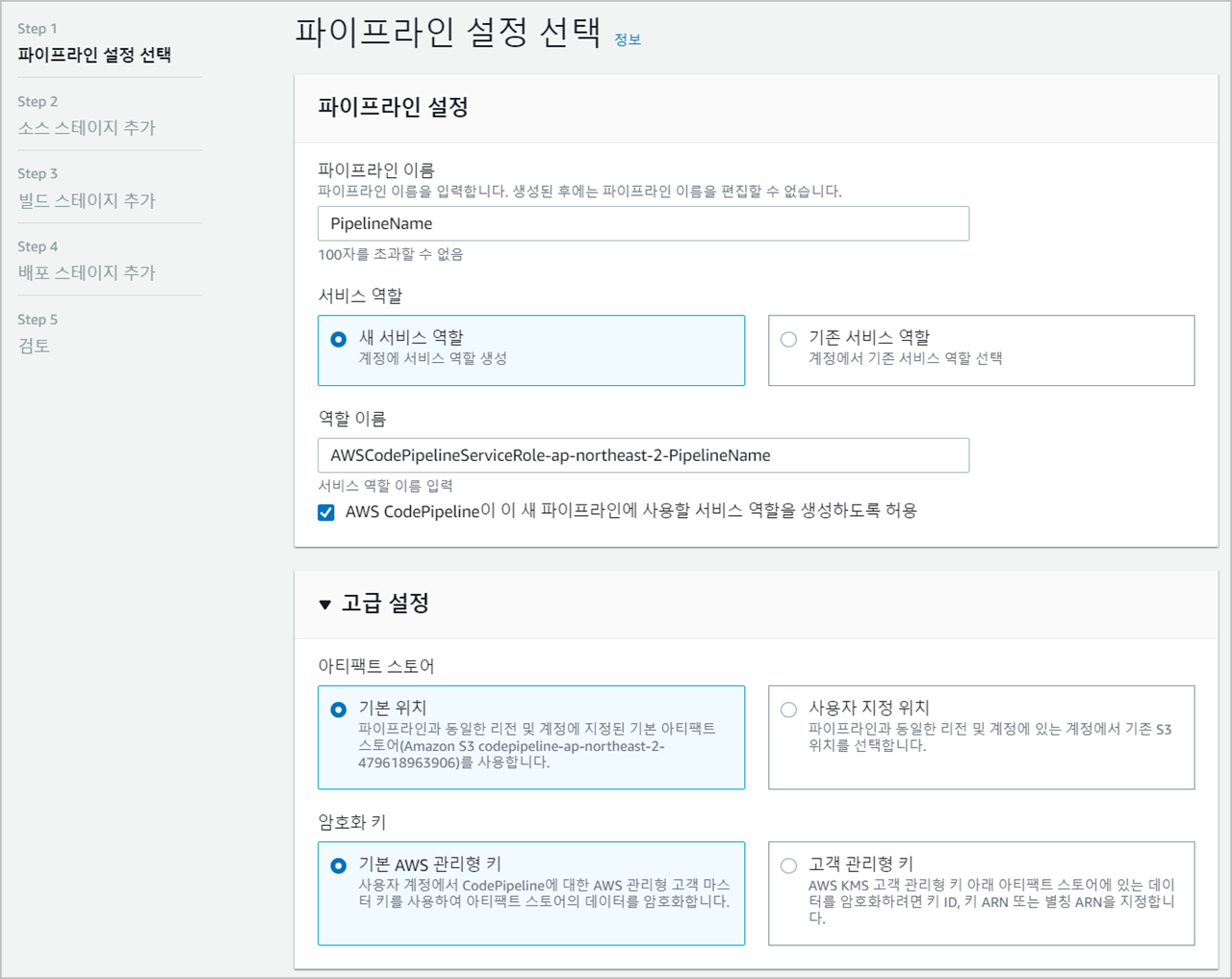 파이프라인 이름과 서비스 역할을 생성합니다. 아티팩트가 저장되는 위치를 지정하고 싶으시면, 고급설정 → 아티팩트 스토어 → 사용자 지정 위치를 통해 지정하시면 됩니다. (기본은 자동으로 생성)