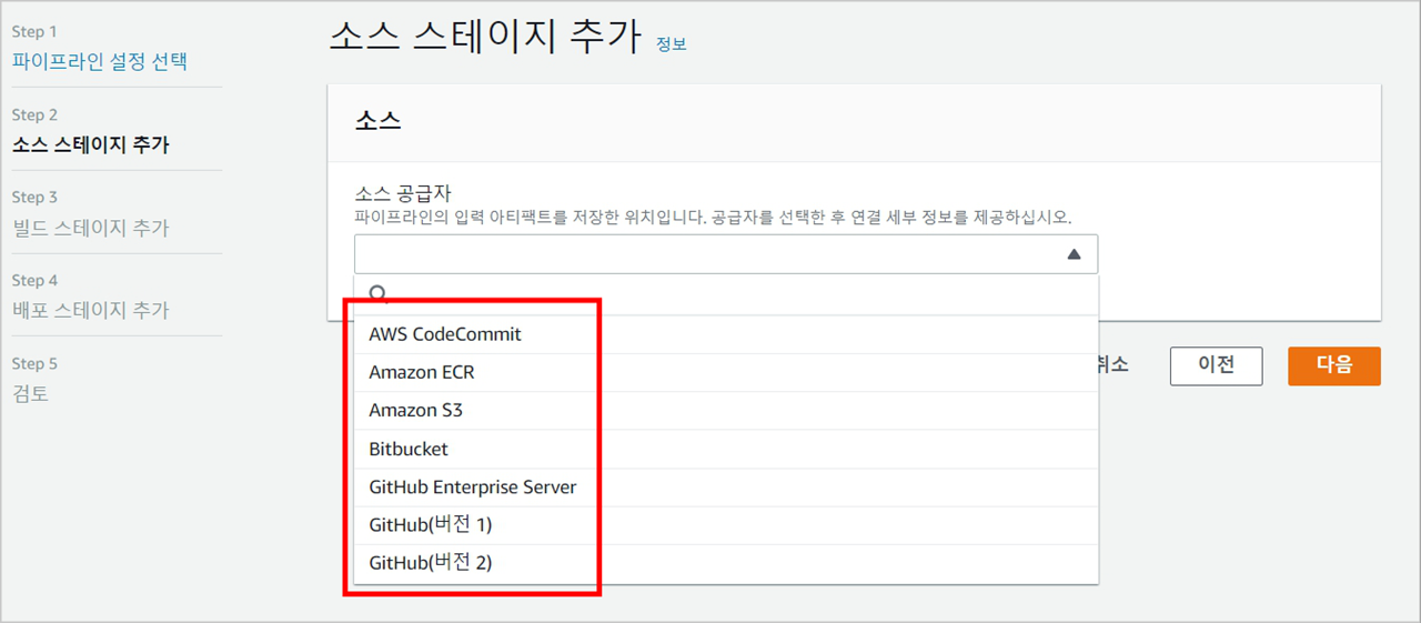 소스를 가져올 위치를 선택합니다. GitLab은 지원하지 않습니다.