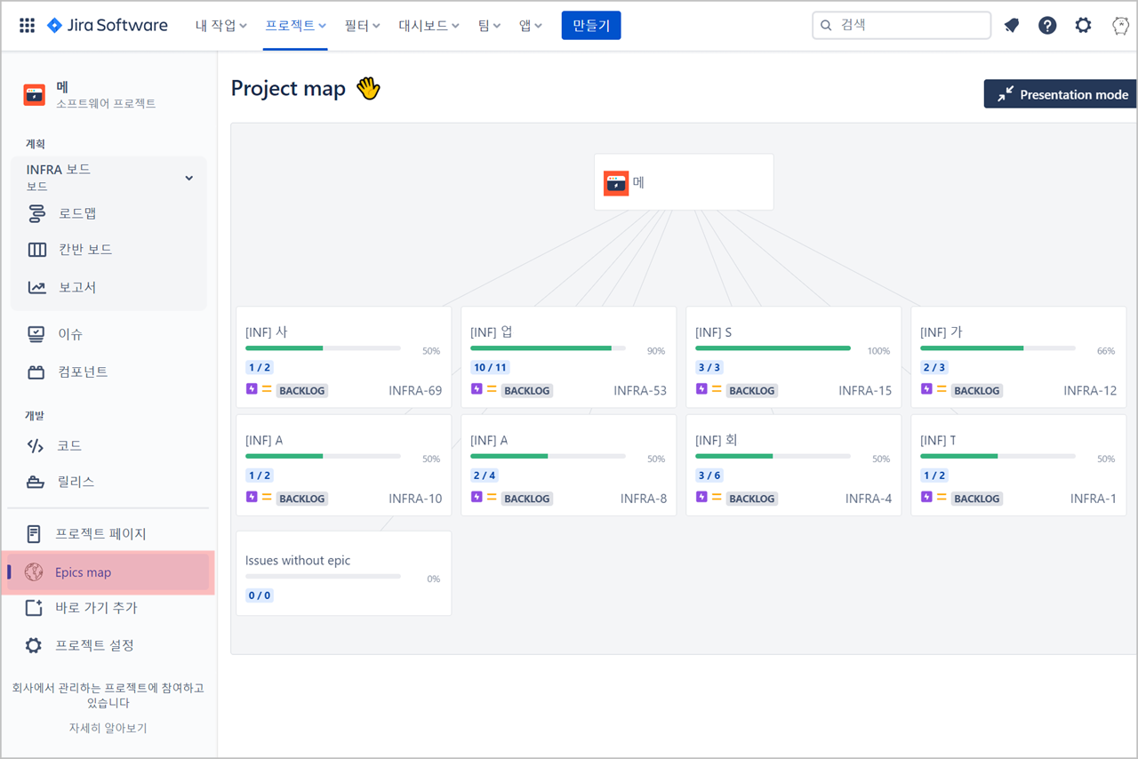 첫 번째 방법은 epics map 메뉴를 통해서 확인하는 방법입니다. 해당 메뉴를 통해 큰 프로젝트에 포함되어 있는 에픽의 개수 및 이름을 확인할 수 있고, 해당 epic들의 이슈 개수와 진행률을 %로 확인하는 것이 가능합니다.
