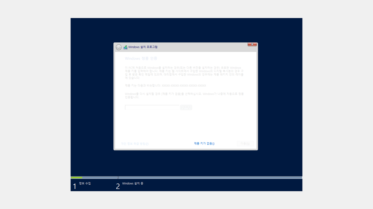 라이선스는 설치하면서 입력해도 되고, 나중에 입력을 해도 됩니다. 나중에 입력할 계획이라면 하단의 '제품 키가 없음'을 선택하고 넘어가면 됩니다.