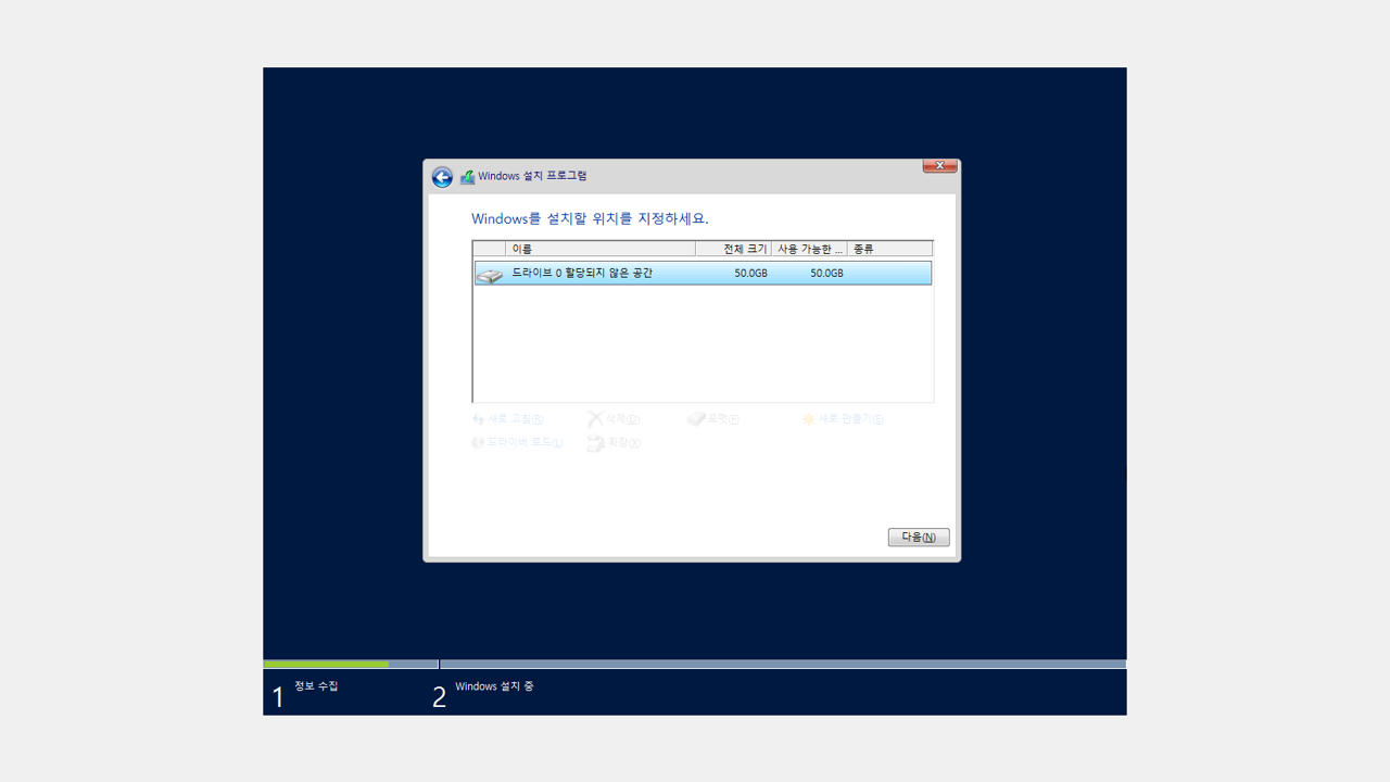 마지막으로 Windows를 설치할 드라이브를 선택합니다.