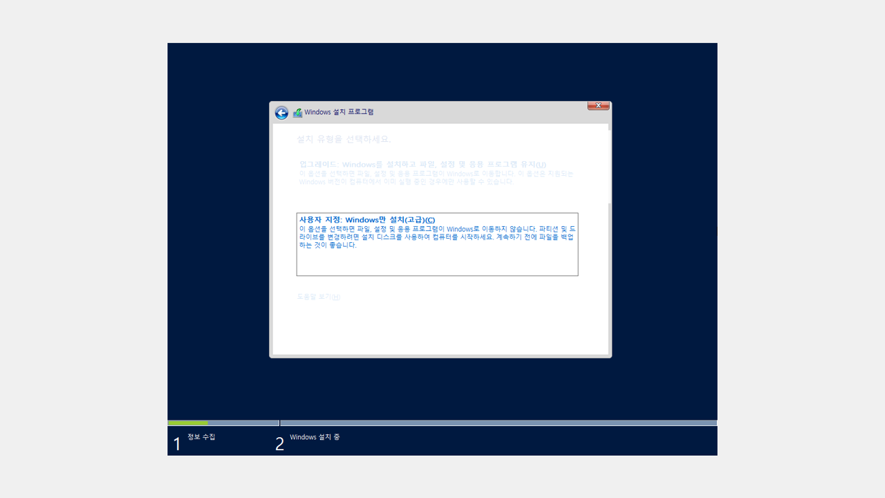 설치 유형을 선택합니다. (신규 설치의 경우 Windows 만 설치로 선택하면 됩니다.)