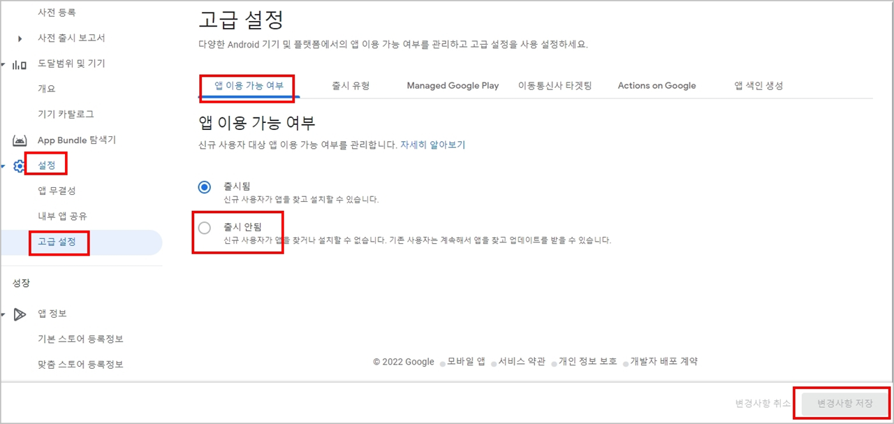 좌측의 '설정' 메뉴의 고급 설정으로 이동하여 '앱 이용 가능 여부'로 이동하여 '출시 안됨'으로 선택하고 우측 하단의 '변경 사항 저장'을 클릭하여 적용합니다.