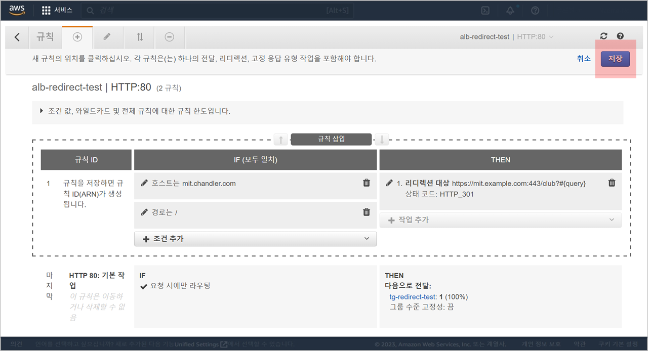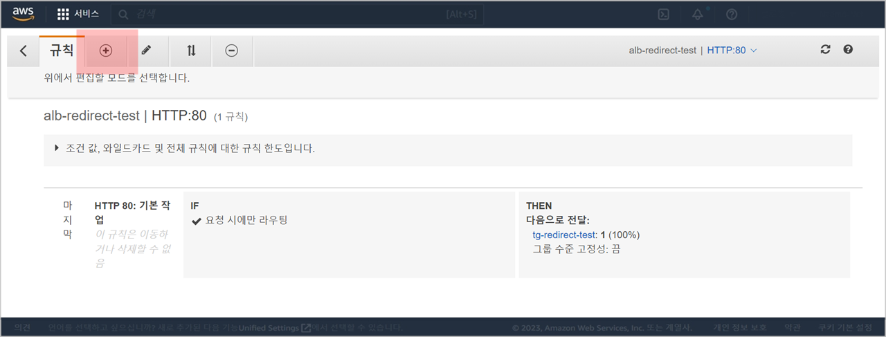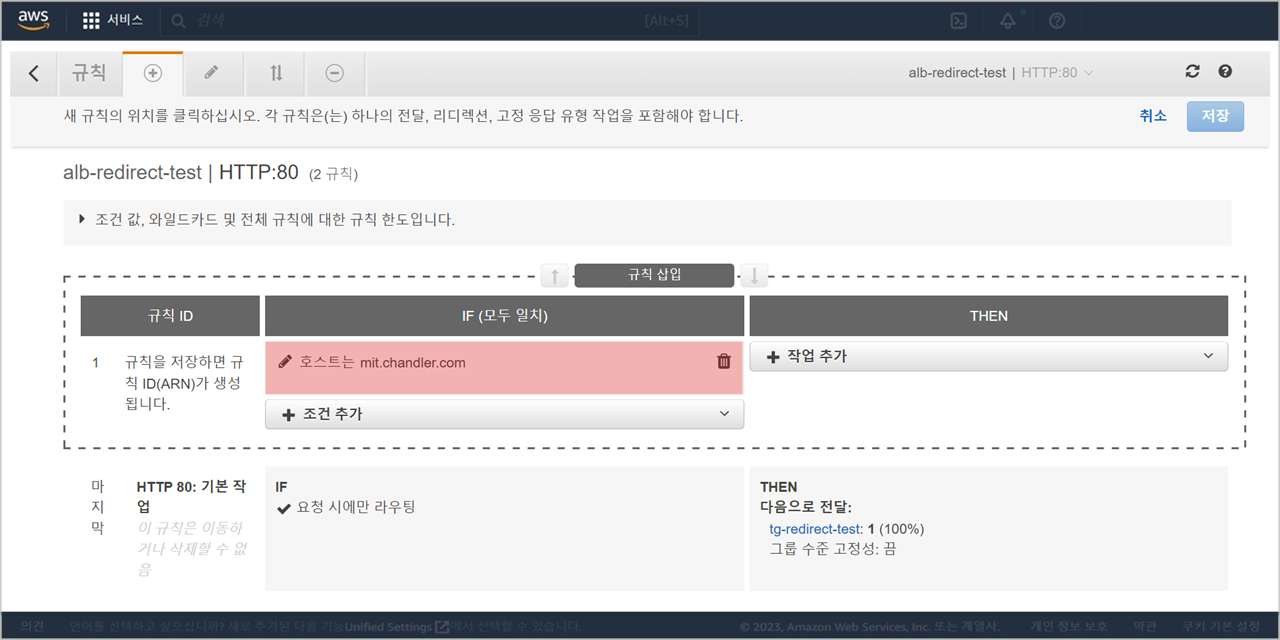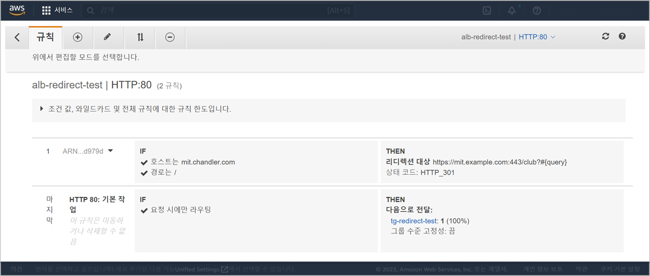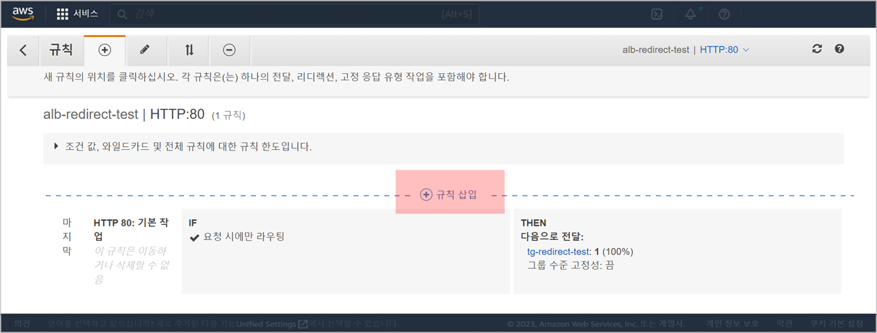 리스너를 클릭하면 detail, rules, tags 등의 메뉴를 확인할 수 있는데, 그 중에서 rules (규칙) 를 선택하고 Manage rules (규칙 관리) 를 선택합니다.