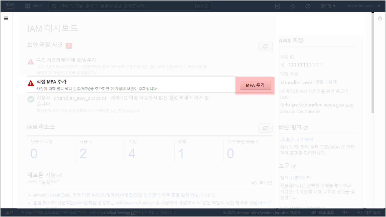 로그인 후 IAM 대시보드에 접속하면 다음과 같이 MFA를 추가하라는 메시지를 확인할 수 있습니다. MFA 추가를 클릭합니다.