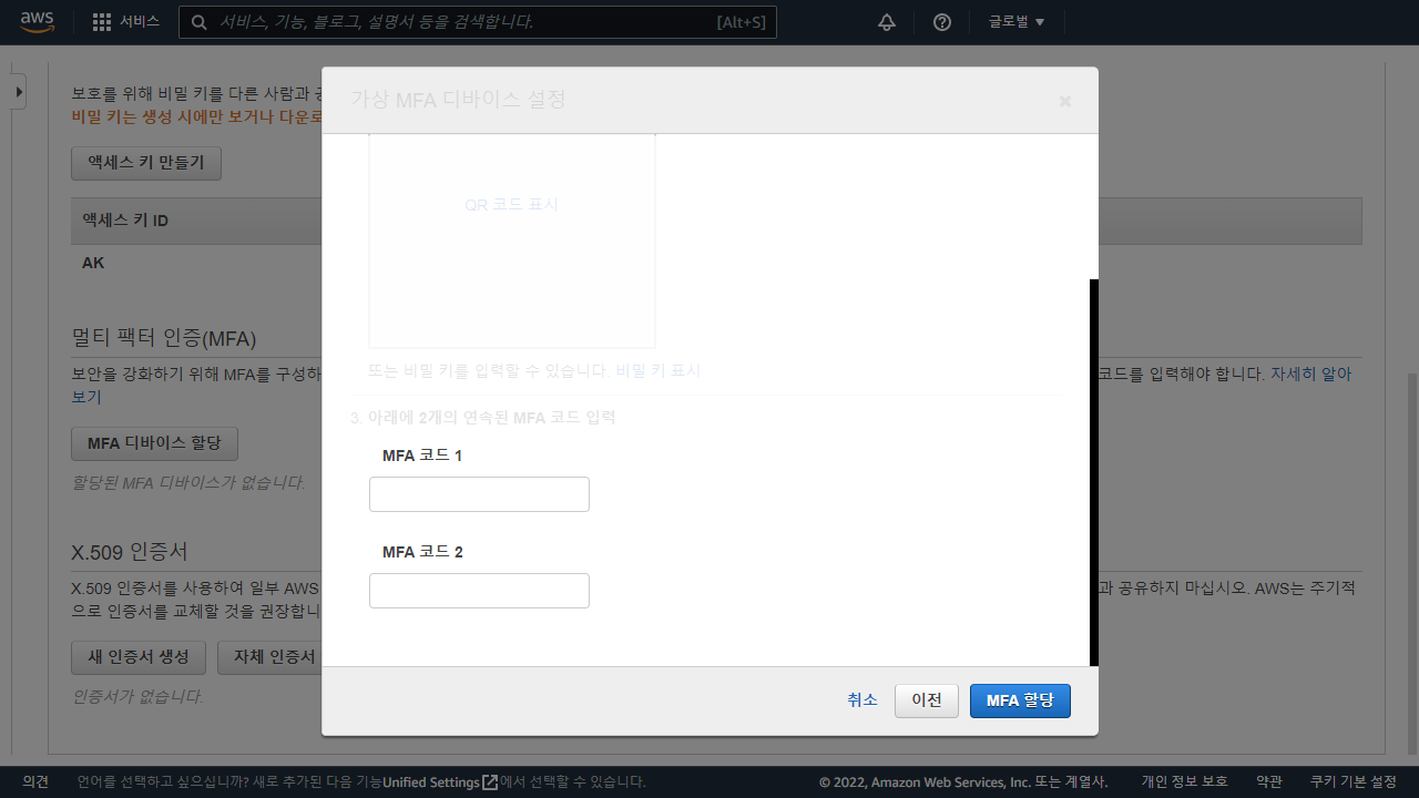 록을 완료하면 MFA 코드를 2번 입력하라고 나오는데, 현재 보이는 6자리 숫자를 입력하고 조금 기다린 다음 갱신되는 6자리 숫자를 다시 입력하면 됩니다. 입력 완료 후 우측 하단의 ‘MFA 할당’을 클릭합니다.