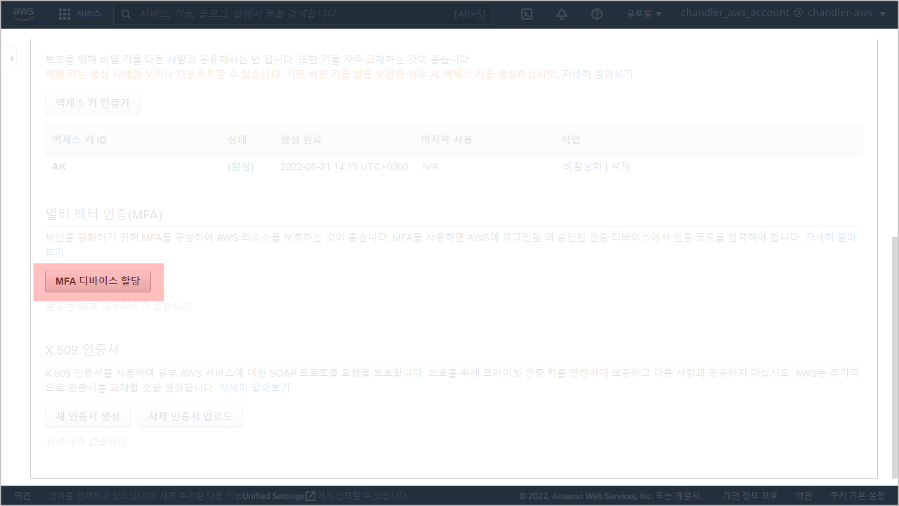 MFA 설정 방법 중 Google OTP 등의 Device를 활용하는 ‘MFA 디바이스 할당’을 클릭합니다.
